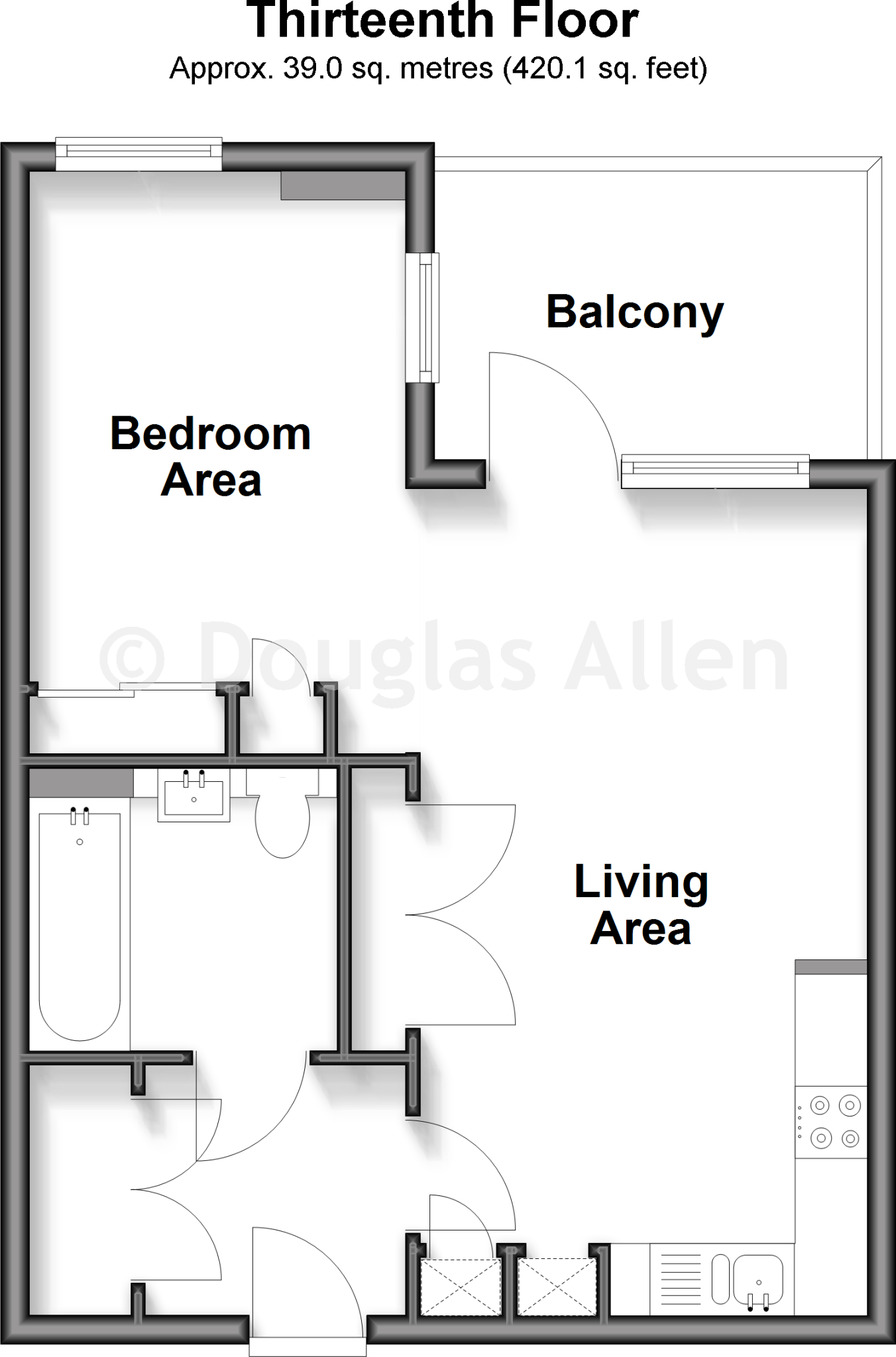 This is a one-bedroom apartment located on Track Street in Walthamstow. The property is listed with Douglas Allen. The apartment is modern and appears to be in good condition, with a well-maintained interior and a balcony. The location is convenient, with nearby transportation options and schools. The price is £375,000, which is slightly above the average price per square foot for the area but seems reasonable considering the condition and location of the property. It is ideally suited to a young professional.