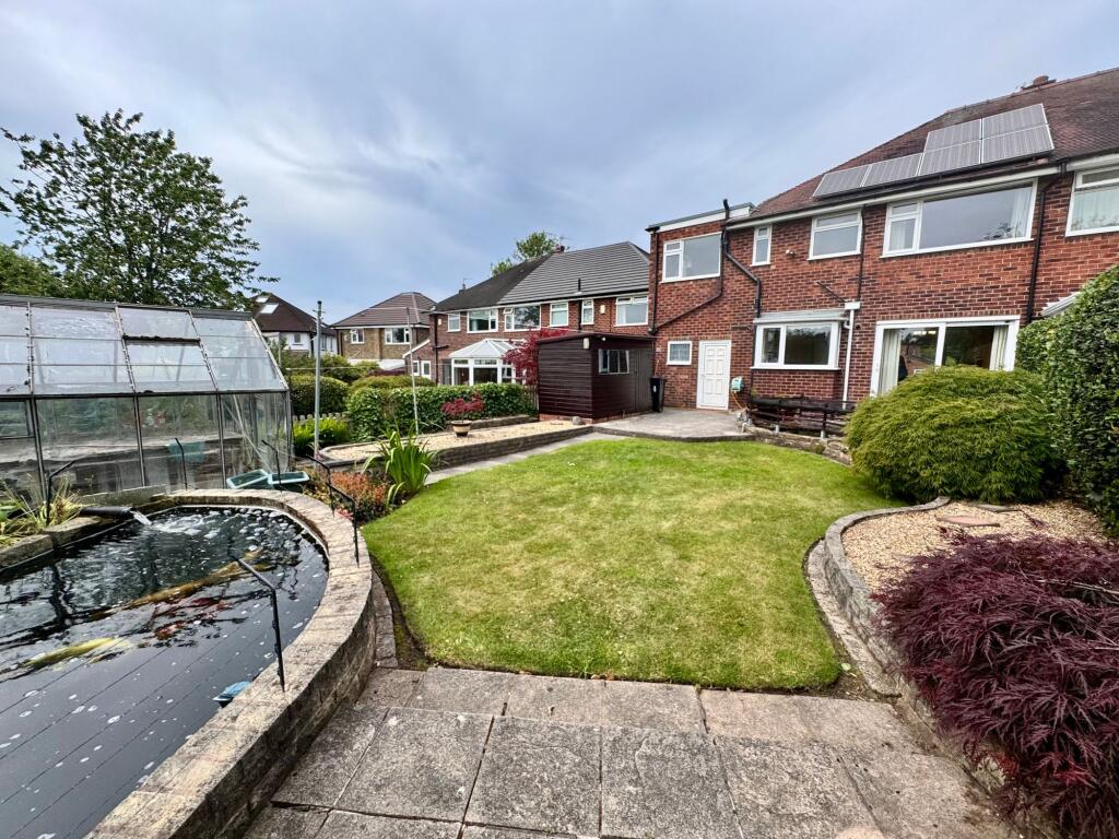 Spacious four-bedroom home in Romiley offers a peaceful garden with koi ponds, generous living space, and off-road parking in a popular residential area.