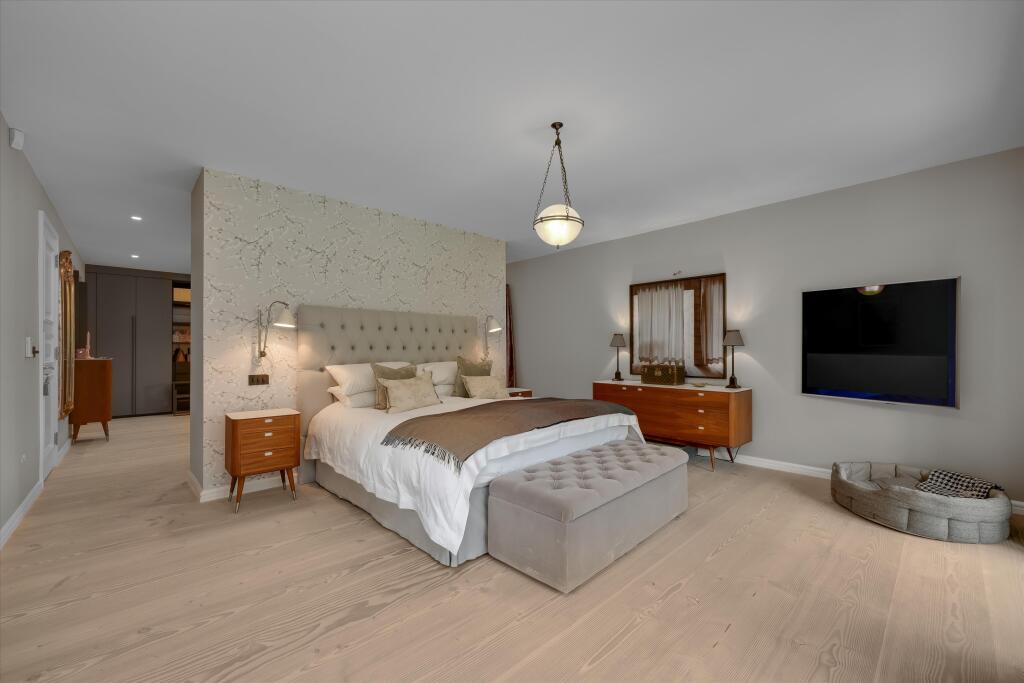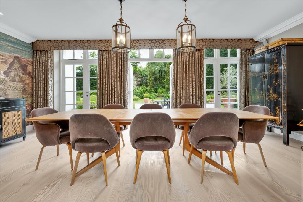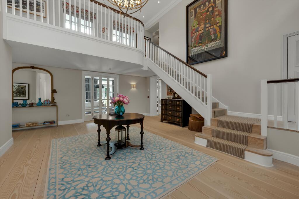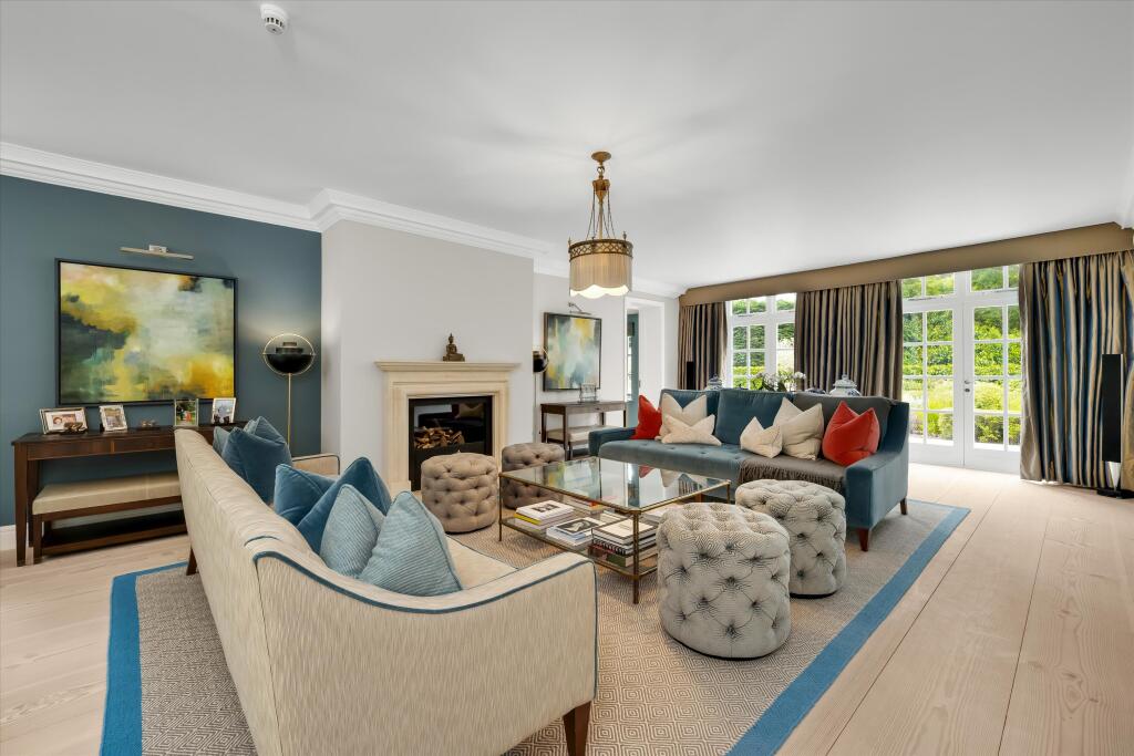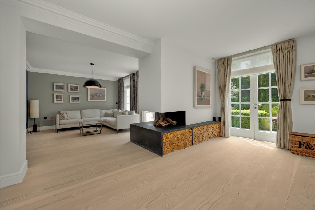 A substantial detached property located on Abbotswood Drive, St George’s Hill, Weybridge, Surrey. The house boasts 6 bedrooms and 6 bathrooms, with a generous 7,282.86 sqft of living space. The property appears to be in excellent condition, with modern interiors and stylish finishes. The property also benefits from a basement and a well-manicured garden with a swimming pool and outdoor entertaining area.