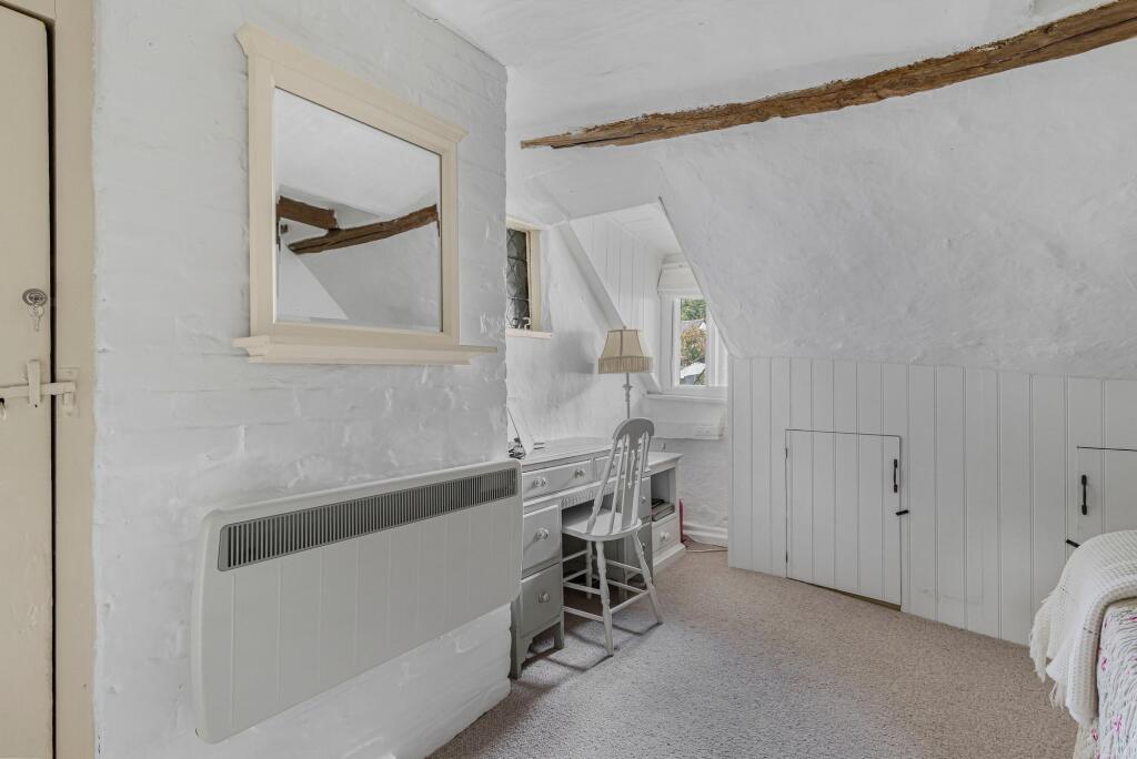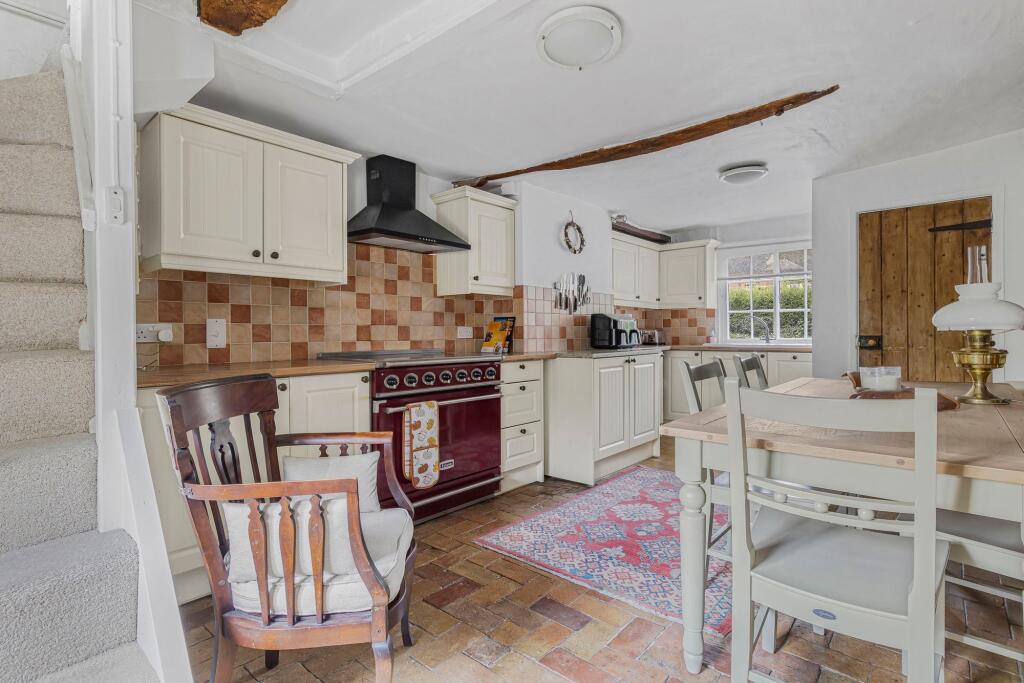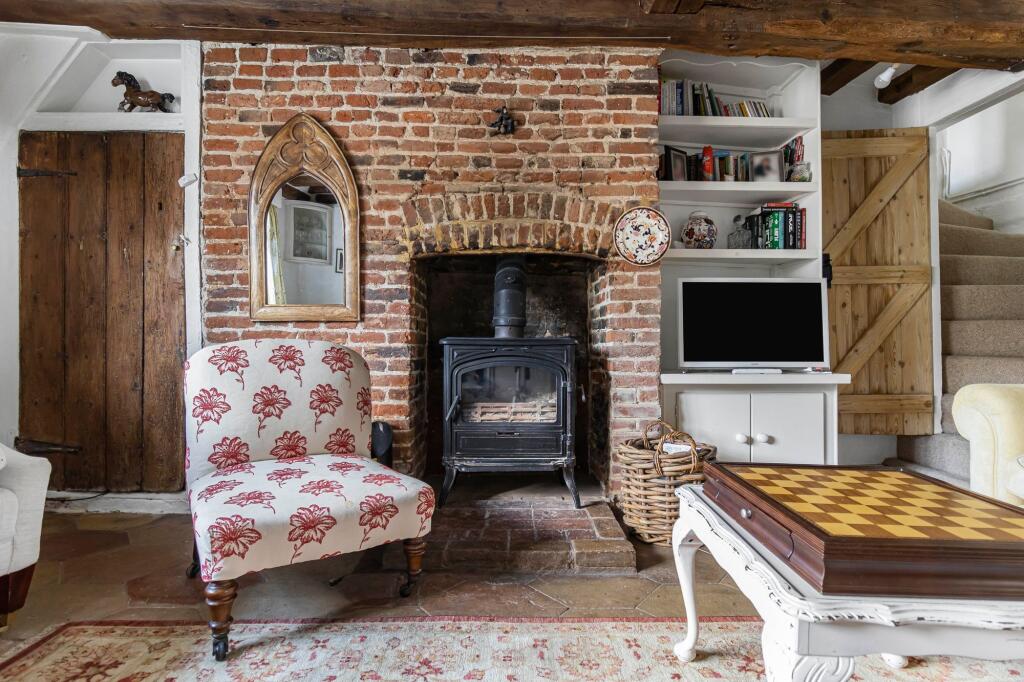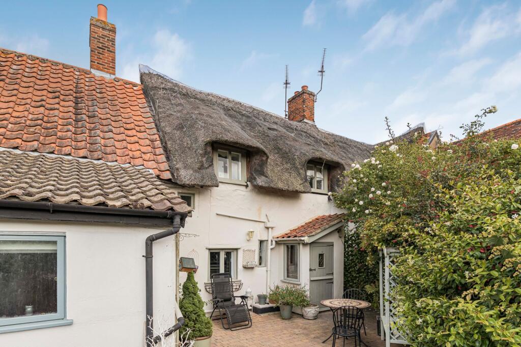 Charming cottage in Monks Eleigh, Suffolk, featuring traditional elements like exposed beams and brickwork. The property includes a well-maintained kitchen and classic-style bathrooms. A paved patio offers private outdoor space.