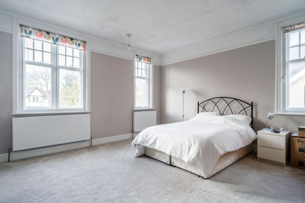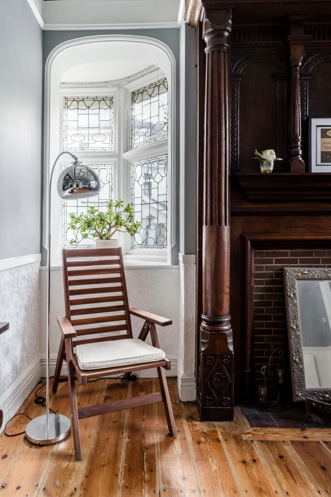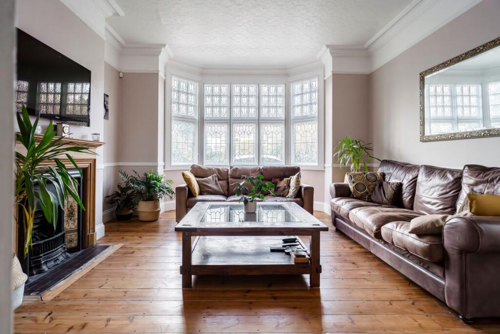 The property appears to be a well-maintained period property, exhibiting traditional features such as bay windows, high ceilings, and ornate fireplaces. The images show the property to be in good condition, with no obvious signs of needing major renovation. The kitchen appears to be relatively modern. The garden is a significant feature, offering a large expanse of lawn, suggesting ample outdoor space.