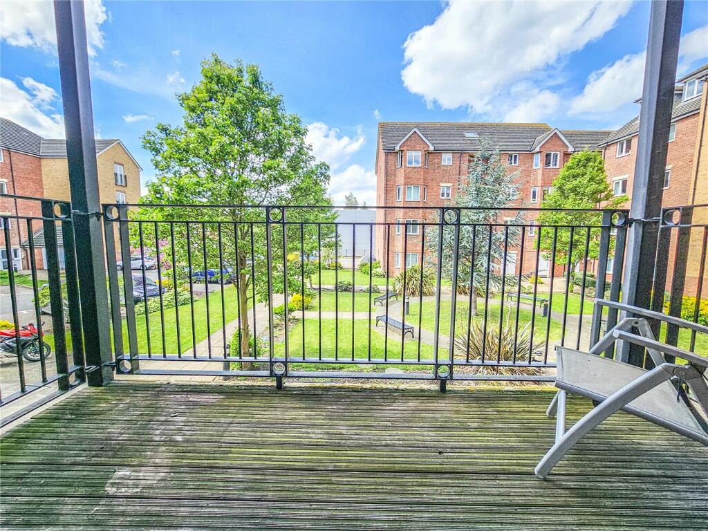 This two-bedroom apartment is situated in Omega Court, Romford, a location which offers convenient access to Romford station and its links to central London. The property is part of a larger apartment complex which has communal green spaces and allocated parking which seems to be secure. The photos reveal a modern apartment with a functional kitchen, a bathroom with a shower over a bath, and a second toilet. The apartment appears generally well-maintained, although the balcony decking shows some signs of age. Notably the images provided do not show the bedrooms or living space which could influence the assessment significantly. There is no indication of the total square footage for the property, making a full assessment of value per square foot difficult. Nearby properties, without specifying square footage, range in price and features. Overall, the property represents a reasonable purchase option for someone seeking a modern apartment in Romford with good transport links and close to various schools.