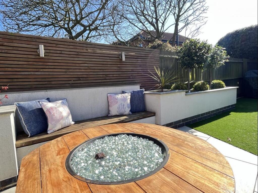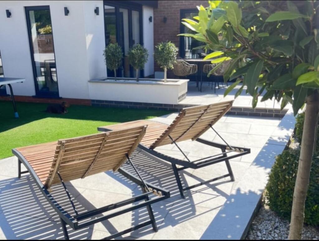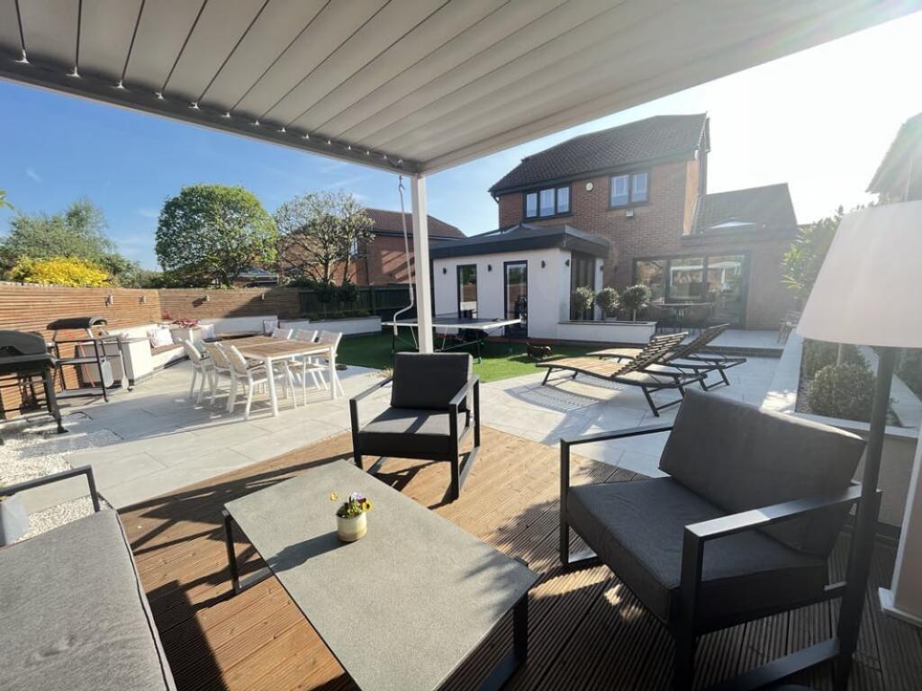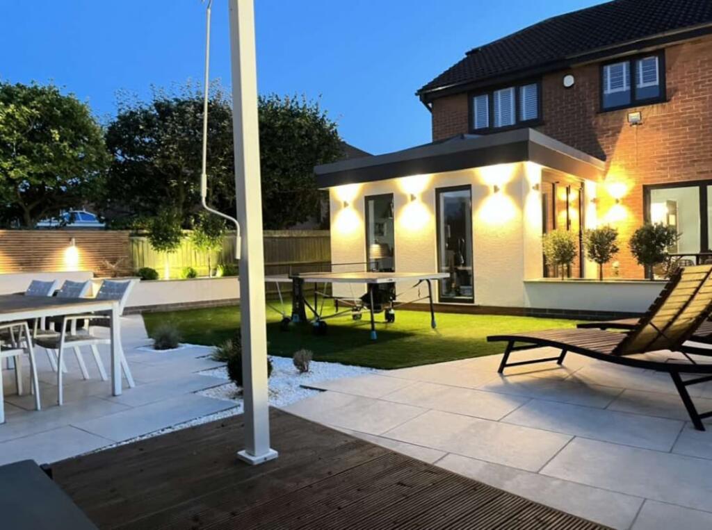 The property includes a significant rear extension that appears to include a garden and patio area. The garden is well-landscaped with artificial turf and patio, suggesting a considerable outdoor space. This contributes to a high land score.