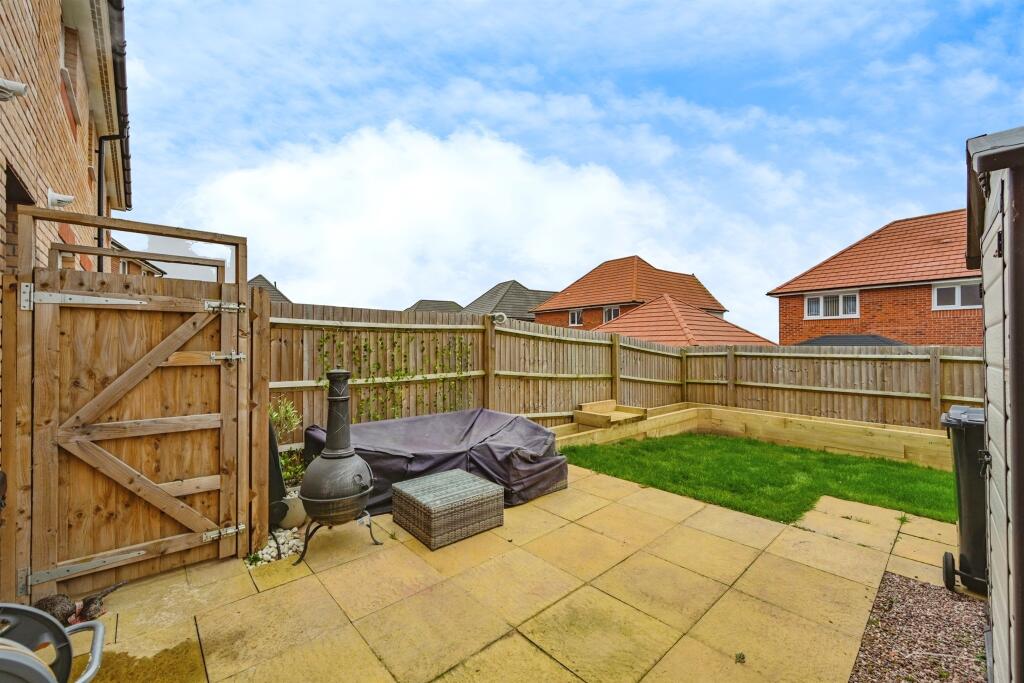The images depict a modern interior with updated kitchen and bathroom fixtures and fittings. The bedrooms appear comfortable and of a reasonable size for a property of this type. A key feature is the inclusion of a small, paved rear garden, providing some outdoor space.
