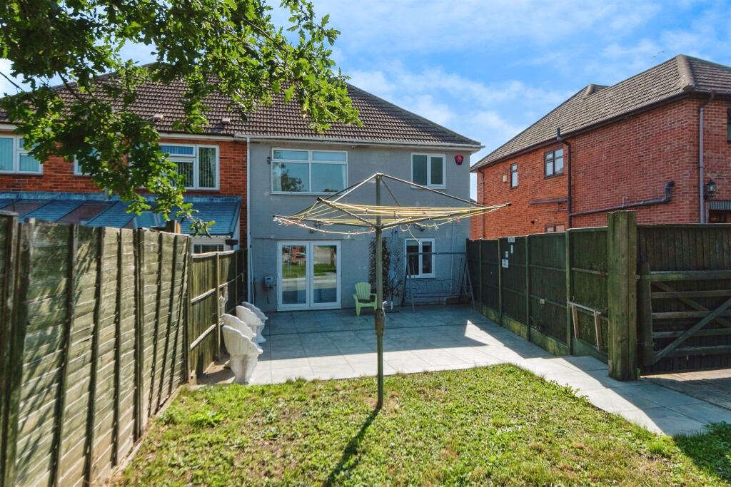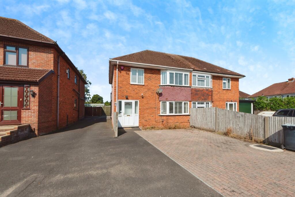 Well-presented three-bedroom semi-detached house with brick-paved driveway and a long rear garden featuring patio, lawn, and additional parking via a shared side driveway. Inside offers a separate front lounge, modern open-plan kitchen/diner with island and glass doors to the garden, downstairs W/C