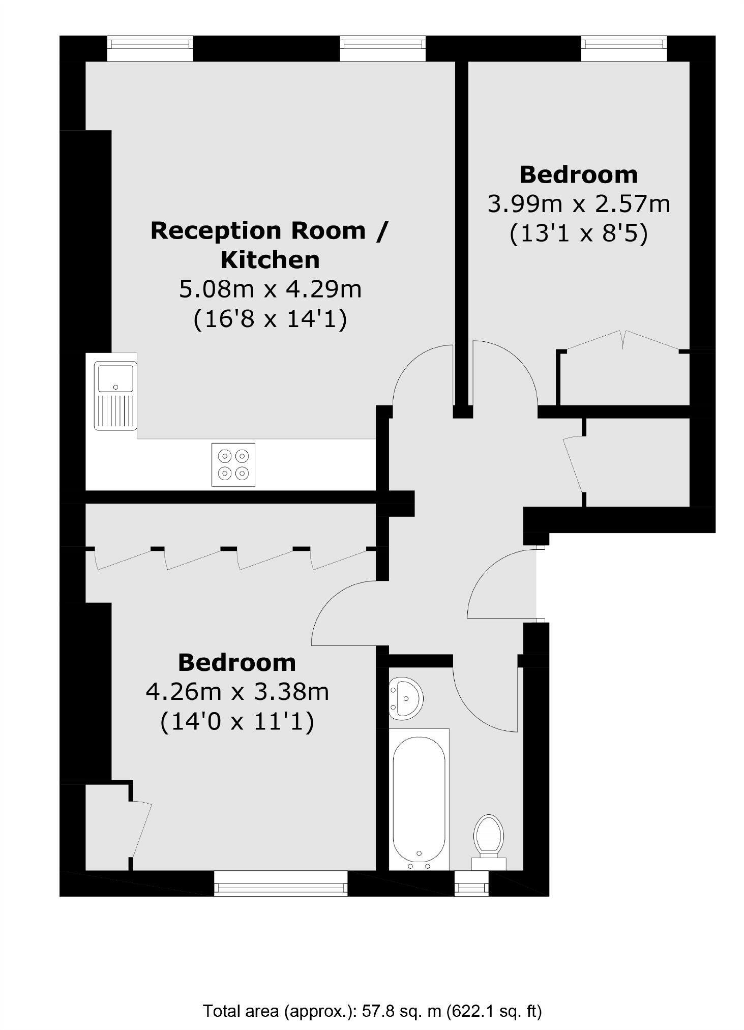 A two bedroom period apartment at approximately 622 sq.ft in the heart of Kentish Town. The apartment has an open plan kitchen / living room with high ceilings and sash windows allowing lots of natural light.