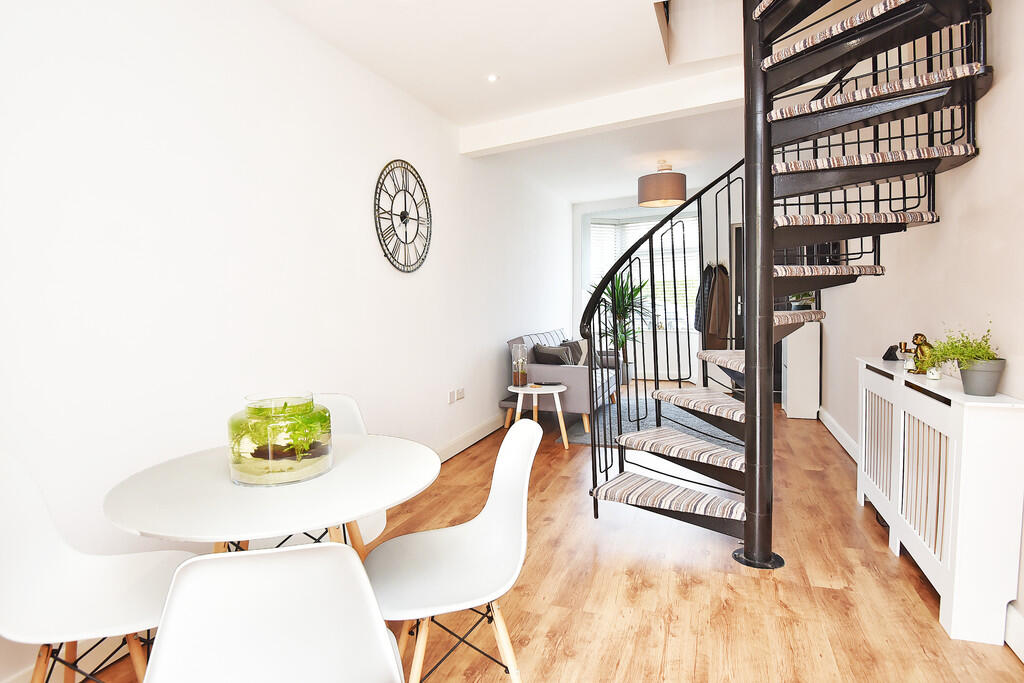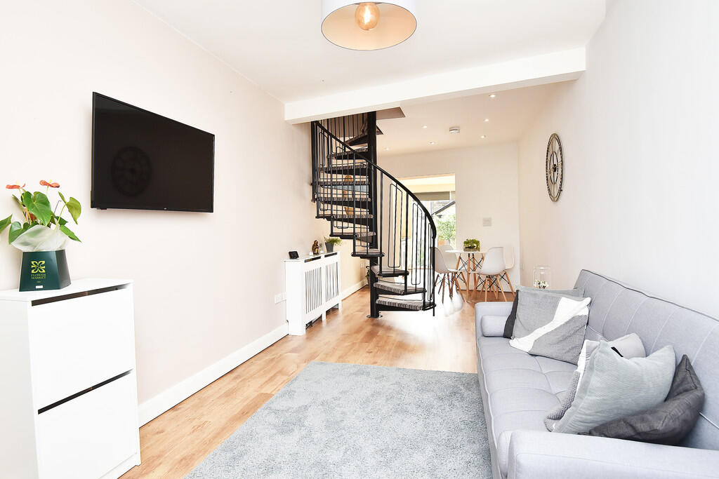 This property is a 2 bedroom end of terrace house located in Birch Grove, Harrogate. The property benefits from a modern extension to the rear, creating a spacious kitchen and dining area with French doors leading to the garden. The property is well presented and in good condition throughout, with a modern bathroom and a spiral staircase leading to the upper floor. The location is convenient, with nearby schools and transportation links. The list price is below the average price per square foot for the area, making it potentially good value for money, however, the size of the property is significantly smaller than the average for the area.