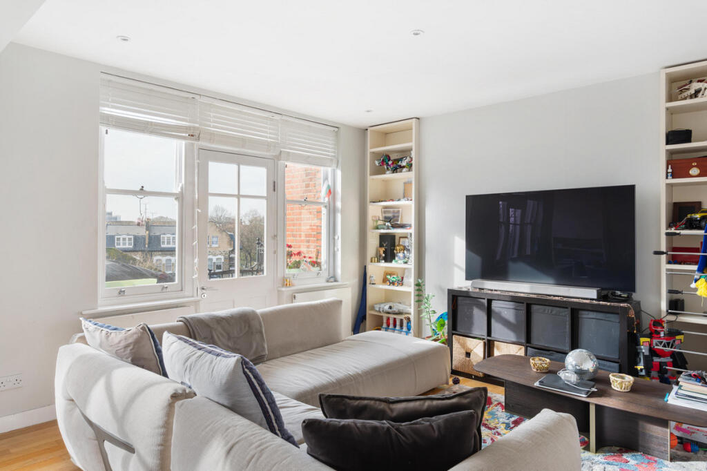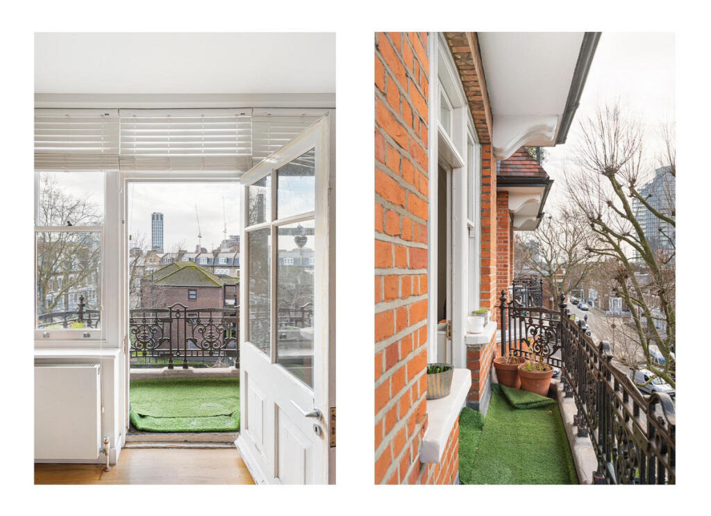 A stunning 3rd-floor apartment with Share of Freehold, double balcony, lift and porter, set within a handsome redbrick mansion building in Chelsea SW10