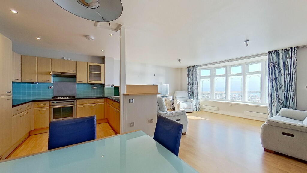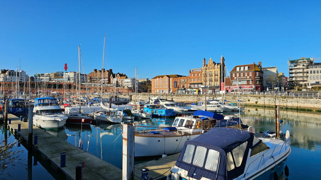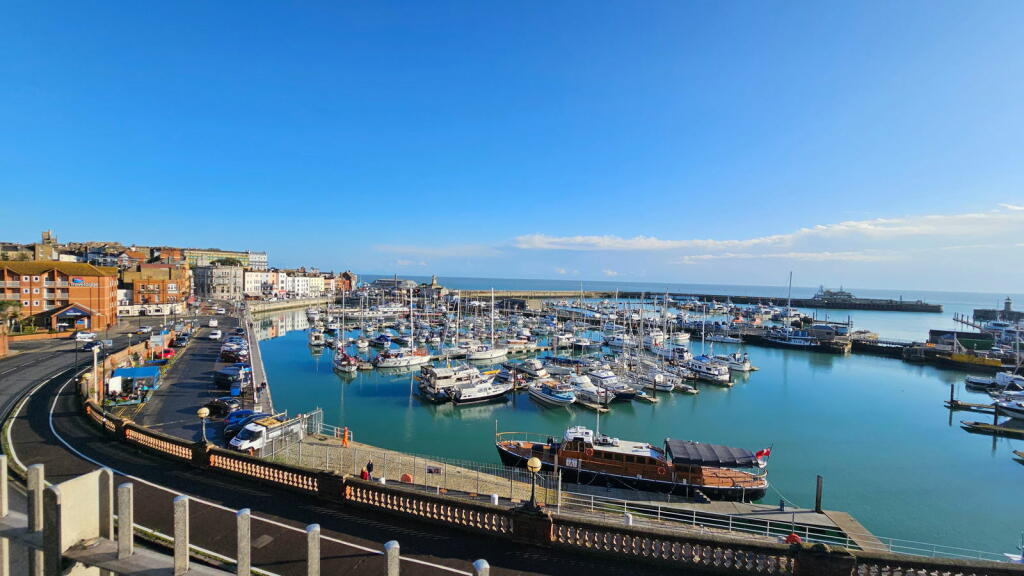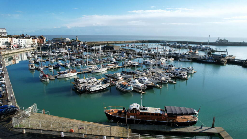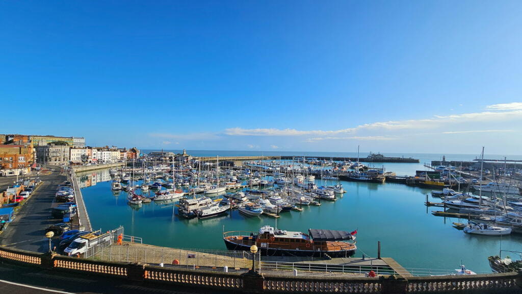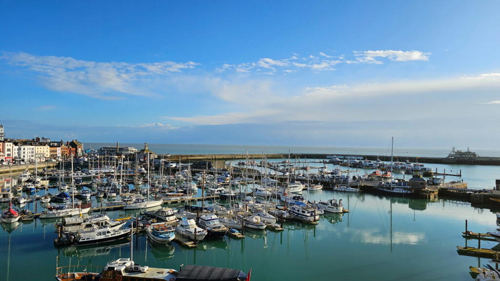 This three-bedroom, two-bathroom flat in Ramsgate’s Central Harbour offers stunning sea views and a convenient location. The property is part of a row of similar buildings situated very near the harbour in a desirable coastal setting. The interior features an open-plan living and dining area with large windows providing panoramic views of the marina and the sea beyond. The kitchen is adequately equipped with light wood cabinets and blue tile backsplash, although the style may be considered somewhat dated. The bedrooms are of varying sizes, with one described as small. The property includes two bathrooms, one with a jacuzzi bath and the other with a shower. The property benefits from its proximity to Ramsgate’s amenities and transport links. The small outdoor space requires some attention. Overall, this property provides a lifestyle that will appeal to buyers seeking coastal living within an accessible urban setting. The property’s condition is acceptable, suggesting that minimal updating or refreshing is required, but a full renovation is not needed. The price, while slightly on the higher side, remains competitive given the superb sea views and attractive location.