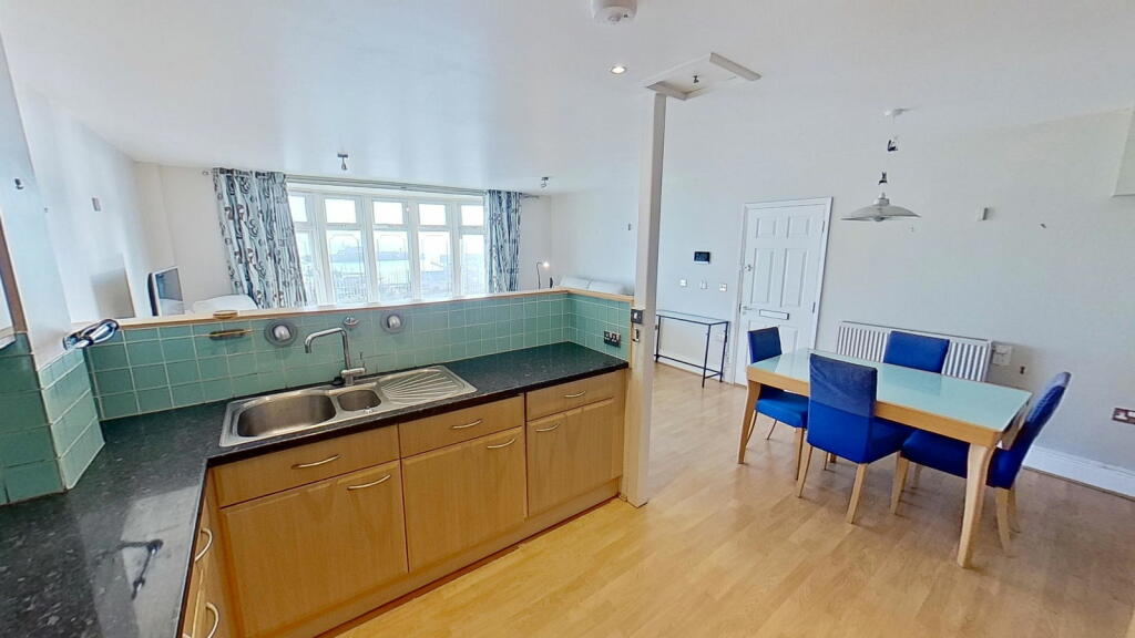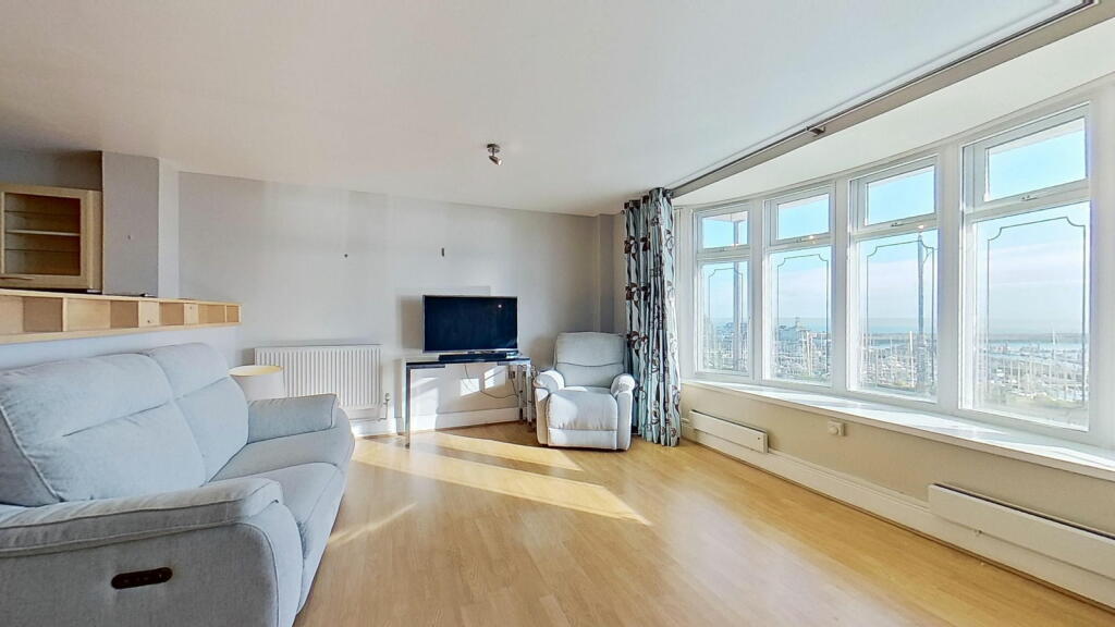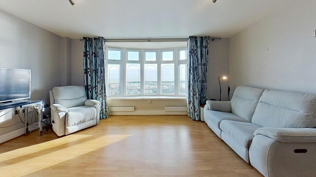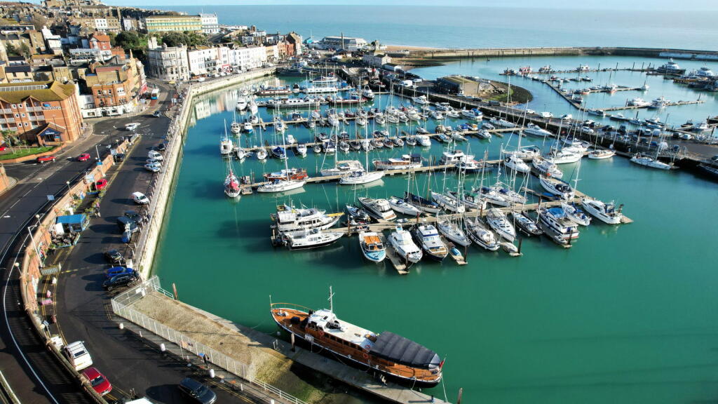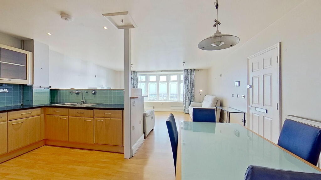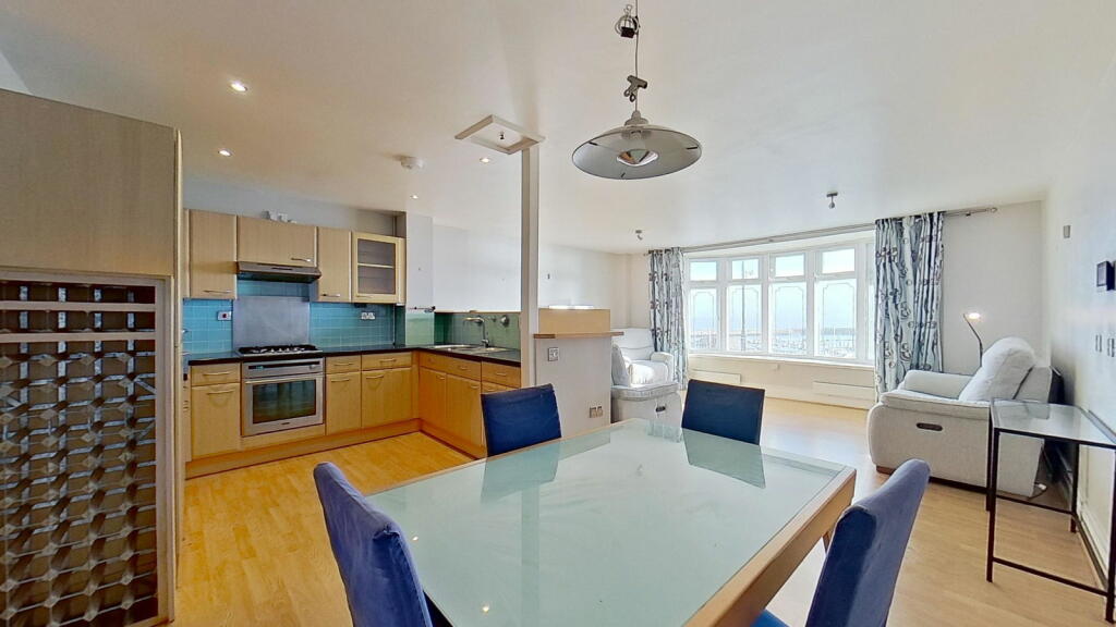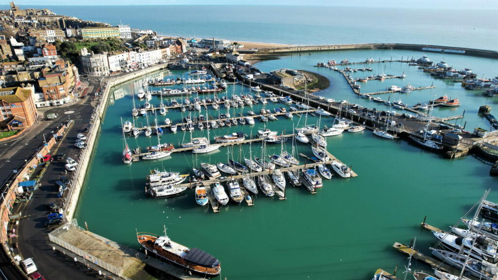 This three-bedroom, two-bathroom flat in Ramsgate’s Central Harbour offers stunning sea views and a convenient location. The property is part of a row of similar buildings situated very near the harbour in a desirable coastal setting. The interior features an open-plan living and dining area with large windows providing panoramic views of the marina and the sea beyond. The kitchen is adequately equipped with light wood cabinets and blue tile backsplash, although the style may be considered somewhat dated. The bedrooms are of varying sizes, with one described as small. The property includes two bathrooms, one with a jacuzzi bath and the other with a shower. The property benefits from its proximity to Ramsgate’s amenities and transport links. The small outdoor space requires some attention. Overall, this property provides a lifestyle that will appeal to buyers seeking coastal living within an accessible urban setting. The property’s condition is acceptable, suggesting that minimal updating or refreshing is required, but a full renovation is not needed. The price, while slightly on the higher side, remains competitive given the superb sea views and attractive location.