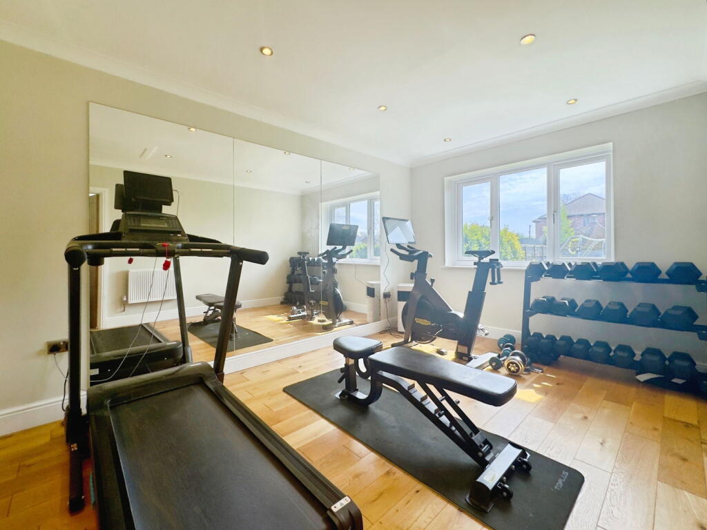 The property appears to be in excellent condition, with modern fixtures and fittings throughout. The images show recently updated bathrooms and kitchen, and well-maintained interior spaces. There is also a substantial garden and outdoor entertaining area, including a decked area and a purpose-built outdoor structure. The property also benefits from a swimming pool, gym, and sauna.