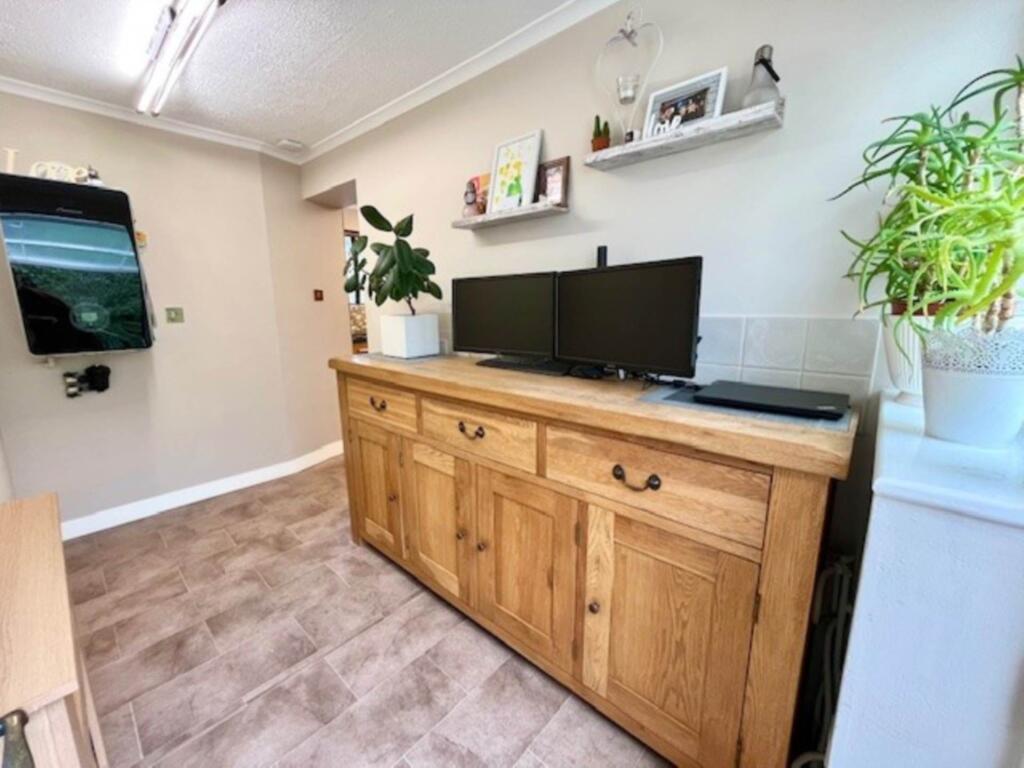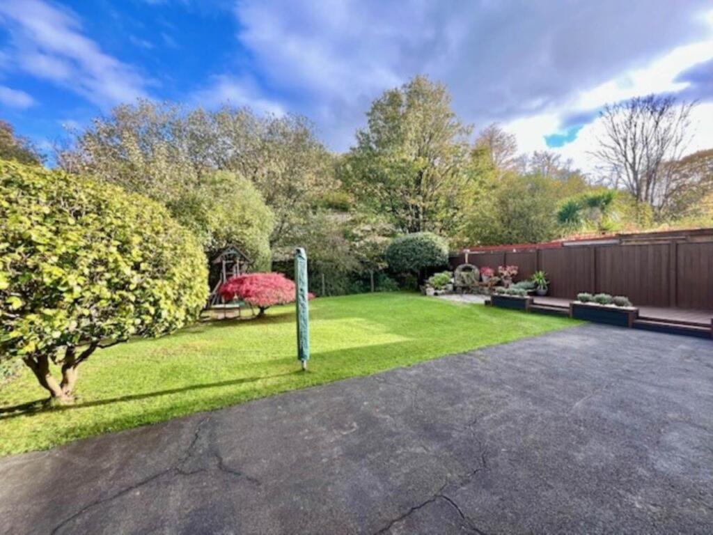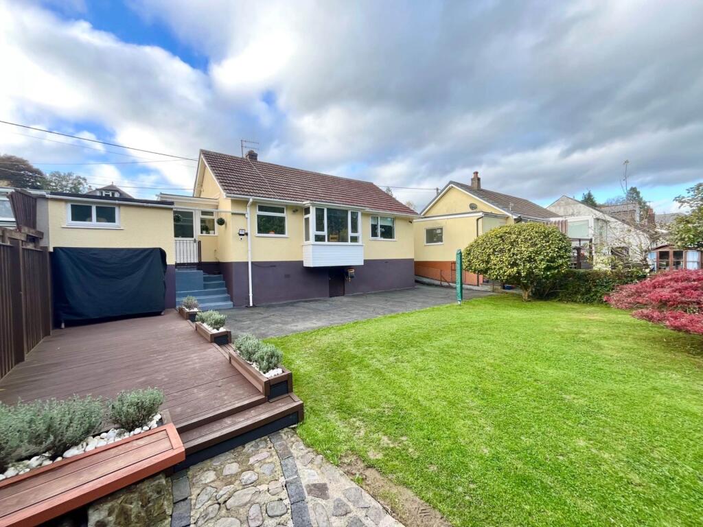This is a two-bedroom bungalow on Plymouth Road, Buckfastleigh, Devon. The property appears to be in good condition, with a modern kitchen and bathroom. It benefits from a good-sized garden and a garage. The property is located close to local schools. The asking price is £295,000, which is slightly above the average price per square foot for the area, but is justified by the condition and garden.