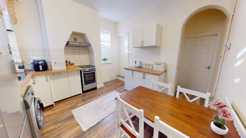 This is a two-bedroom terraced house in Shelton, Stoke-on-Trent. The property is in reasonable condition, with a modern bathroom and kitchen. It has a small outdoor area. The location is near schools and amenities, but not in the most desirable area. The asking price of £100,000 appears reasonable for the property type, size, and location. The property is being listed by Goodchilds.