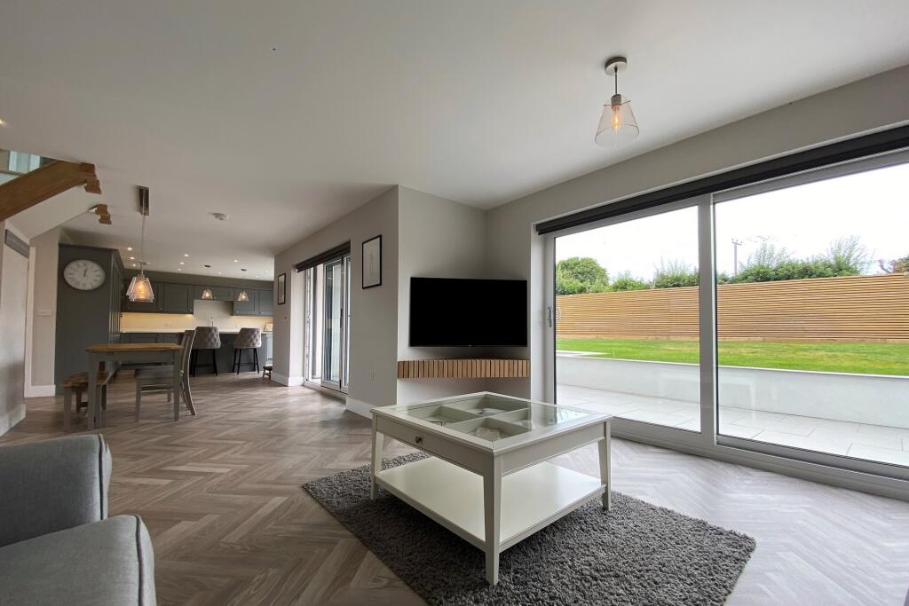 The property’s interior is showcased in detail, revealing a contemporary design with high-end finishes. The kitchen is modern and well-equipped, and the living areas are spacious and bright, with an open-plan feel. Multiple images highlight the large garden, which features patio areas ideal for outdoor entertaining. The presence of an additional building (presumably a garage or other outbuilding) on the property is suggested by the photos, though further details are needed for confirmation. One image implies the property also boasts sea views, although it is not clear to what degree.