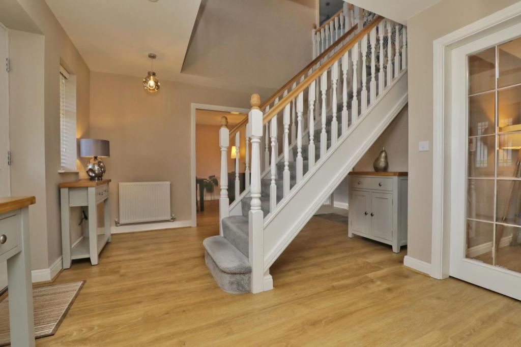 This five-bedroom, three-bathroom detached house in Snowden Drive, Retford, presents as a well-maintained and modern family home. The property boasts a contemporary interior design, with a high-spec kitchen that seamlessly flows into a spacious living area, ideal for family living. The inclusion of multiple bedrooms and bathrooms, coupled with an apparent double garage, suggests ample living space for a larger family. The photos reveal a neat and well-landscaped garden, adding to the property’s overall appeal. The location, close to Retford Train Station and several primary schools, is a significant advantage for families seeking convenient commuting and schooling options. Whilst the information provided on local amenities, such as shopping facilities and places of interest is limited, the surrounding area suggests a range of property types and values. The absence of precise details regarding the plot size prevents a thorough evaluation. The property is a well-presented home that offers good space for a family. However, more information on the plot size and the area’s amenities would allow for a more robust assessment.