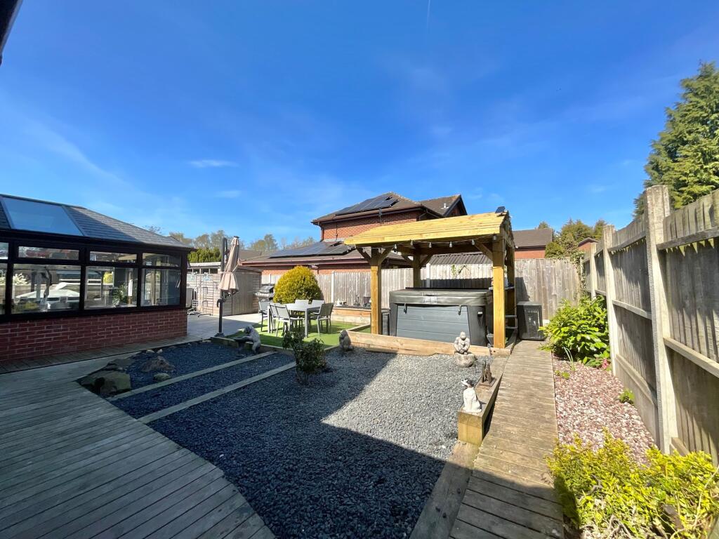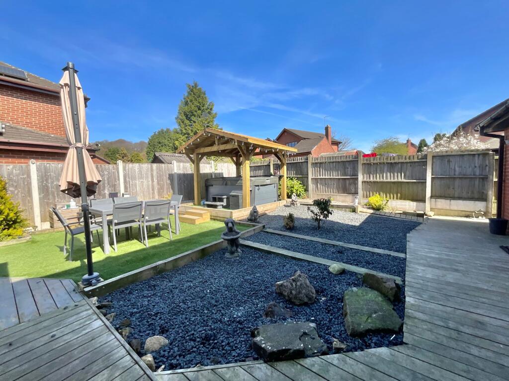 This property is a 4-bedroom, 2-bathroom detached house located in Cheadle, Staffordshire. The house appears to be in good condition, with a modern kitchen and bathrooms. There is a large garden with a hot tub and patio area, and ample off-street parking. The property is within a reasonable distance of local schools and amenities. While the average price per square foot in the area is £288, this property is listed at a price that is above average, but comparable to other similar properties in the area. The list price of £440,000 may be considered slightly high given the average house price in the area is £273,388, but the larger size and additional features of this property justify the higher price point.