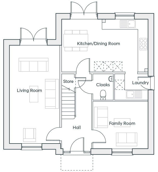 Open plan dining/kitchen with integrated appliances and French doors to the garden · Living room with French doors to the rear garden · Separate family room · Downstairs cloakroom · Laundry room off the kitchen · Master bedroom with en-suite and walk-in wardrobe &