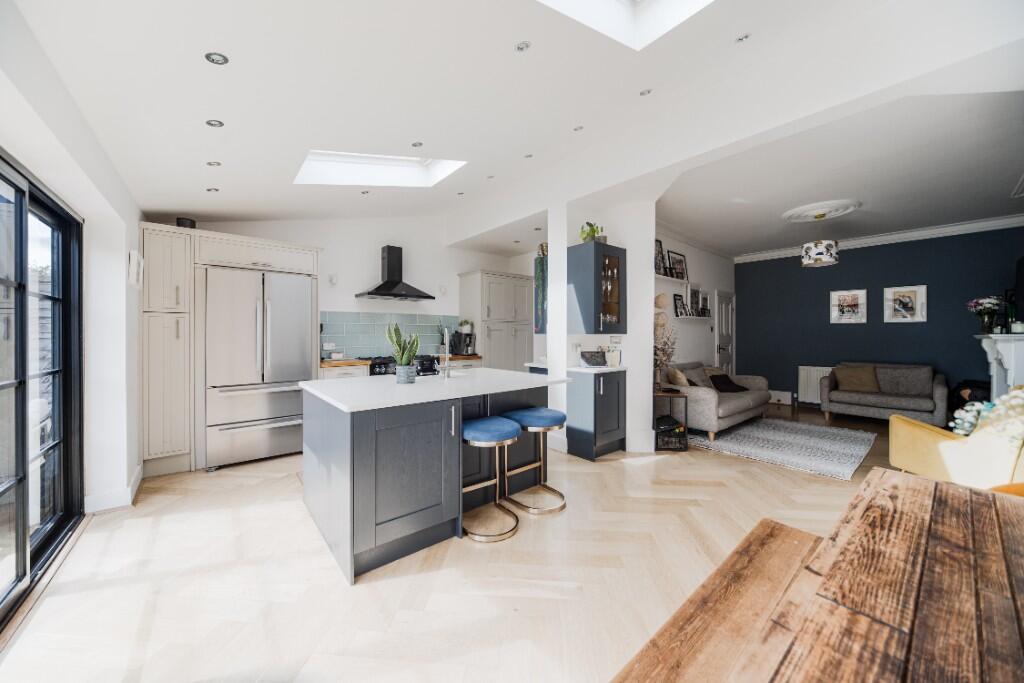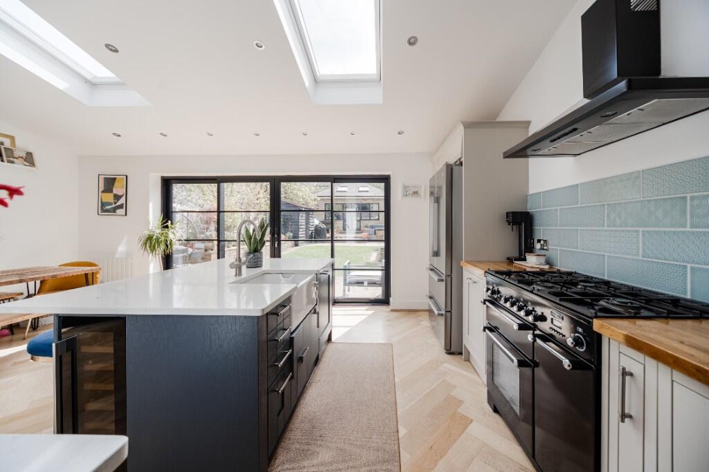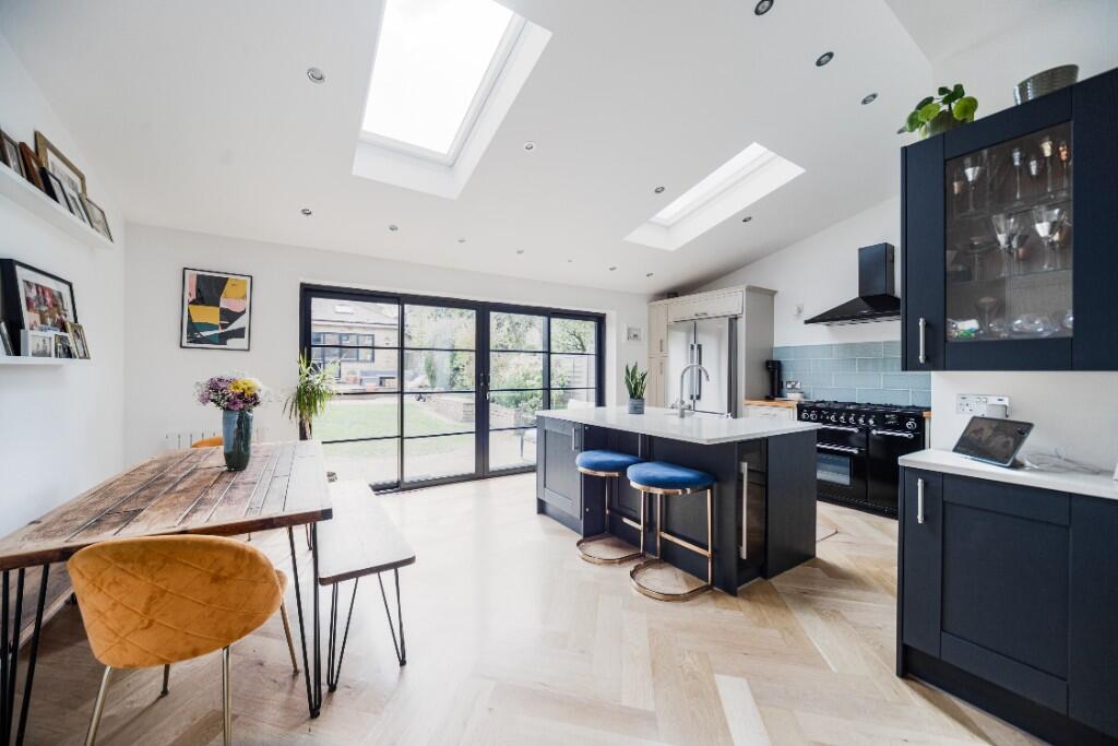 This property is a 4 bedroom, 3 bathroom end of terrace house located in Enfield, London. The property has been significantly extended and modernised, boasting a large open-plan kitchen/diner with bi-fold doors leading to a sizeable garden. There is also a gym/office extension to the rear. The property benefits from being close to several highly-rated schools and transport links. While the plot size is not specified, the garden appears substantial. The list price is higher than the average for the area, but this is likely justified by the property’s size, condition, and recent improvements.