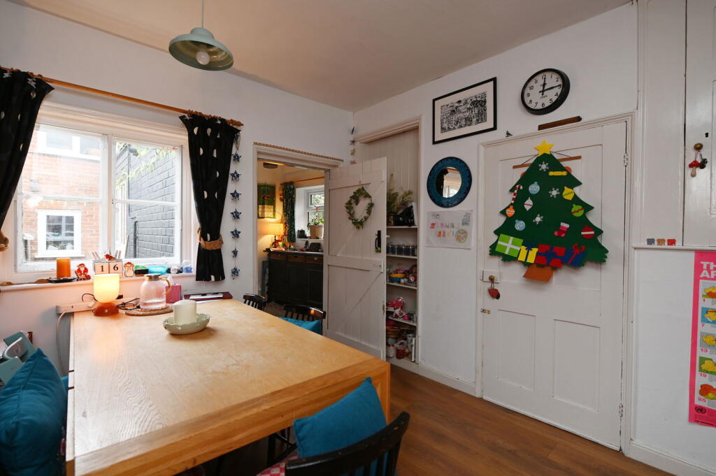 This is a four-bedroom terraced house located on High Street in Wickham Market, Suffolk. The property offers 1,595.21 sqft of living space and is listed for £285,000. The house features a blend of traditional and modern elements, with a recently updated kitchen and bathroom. The property includes a garden, enhancing its appeal. The location is central, with Wickham Market Primary School nearby. While the interior design may not suit all tastes, the competitive price and ample living space make it an attractive opportunity.