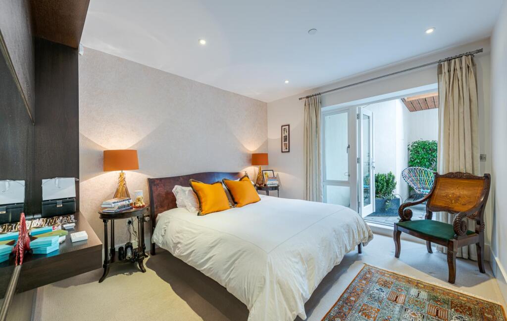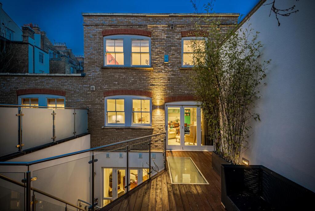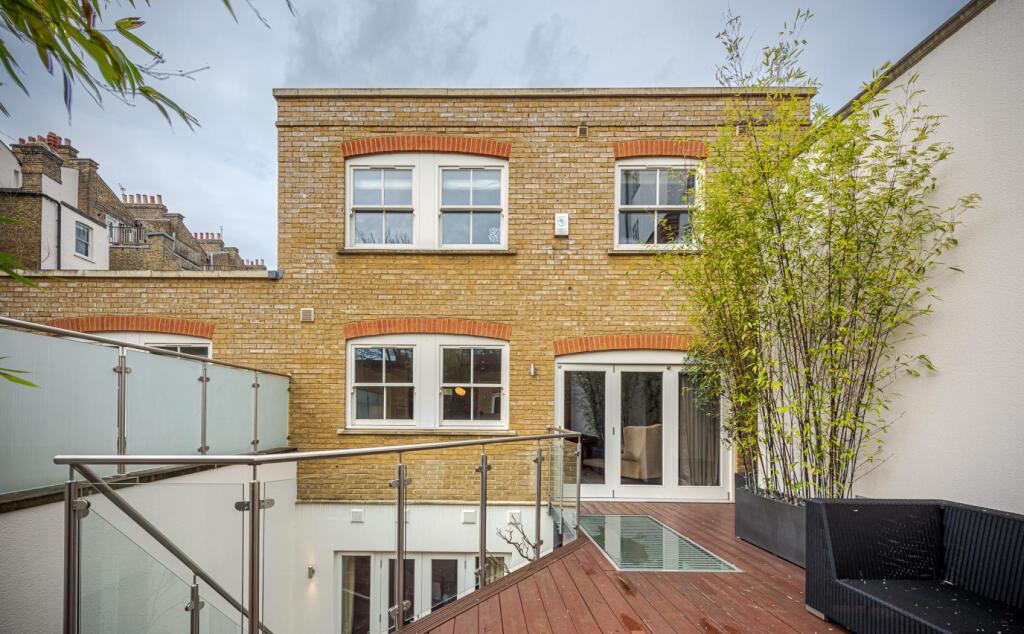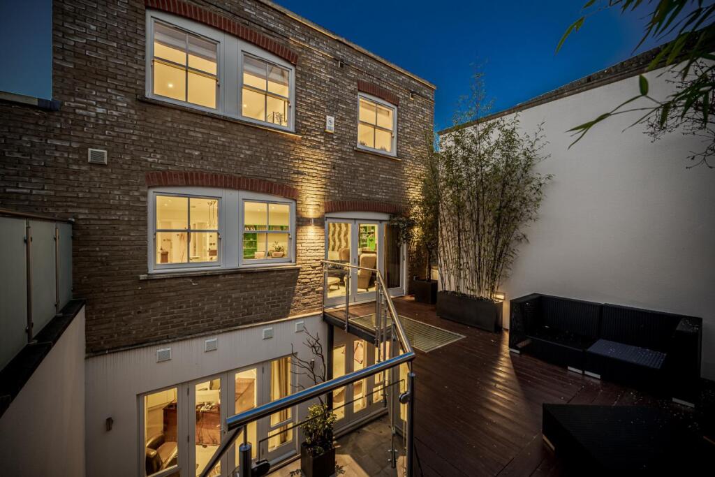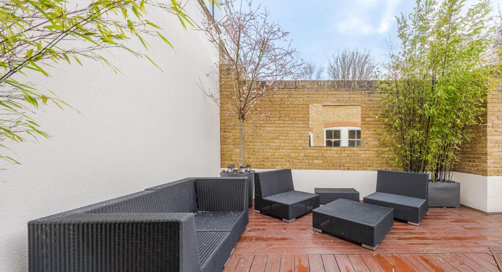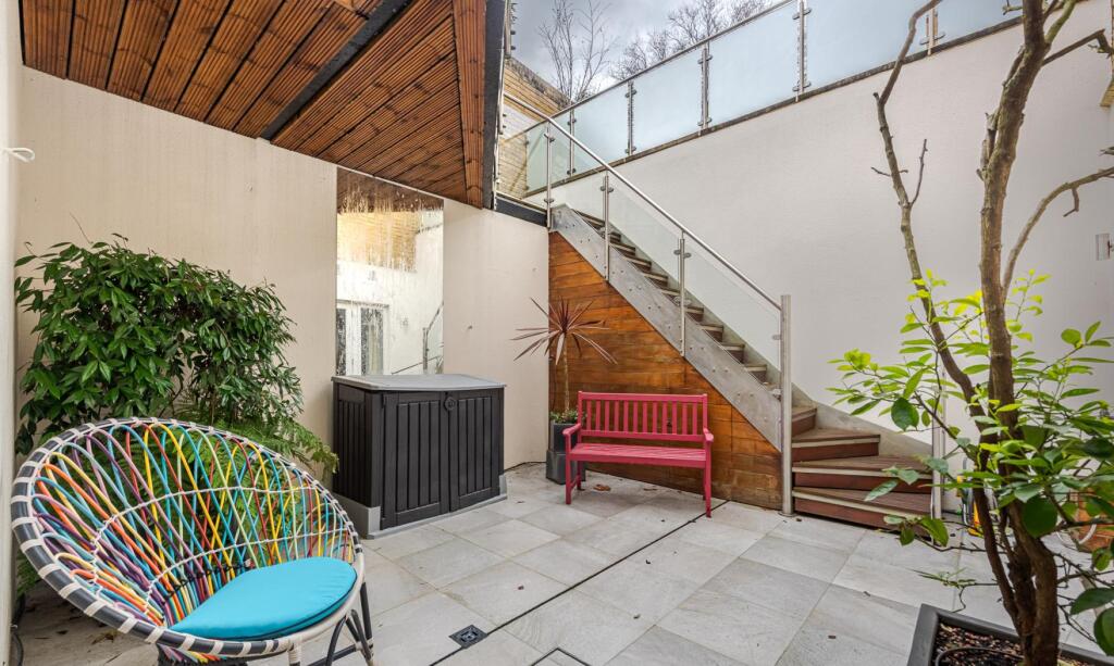 The property includes a substantial private outdoor space, which is a rare and valuable feature in central London. The images show a well-designed patio area, perfect for relaxation and entertaining. The size of the plot, at 3,008 square feet, is considerably larger than average for properties in this area, further enhancing its desirability.