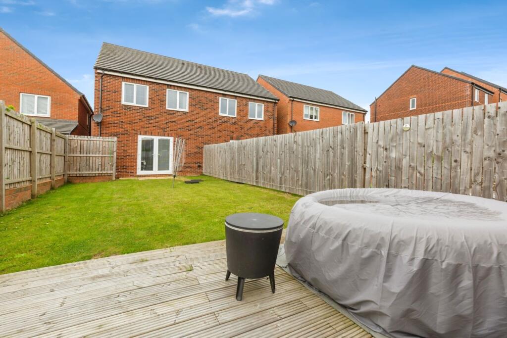 This is a modern semi-detached property in Redhill, Sunderland. The house features three bedrooms and two bathrooms. The interior is well-maintained with a modern kitchen and bathrooms. It also benefits from a garden with both lawn and decked areas. The property is located near schools with good Ofsted ratings and has good transport links. The asking price is slightly above the average for the area, but reflects the property’s condition and features.