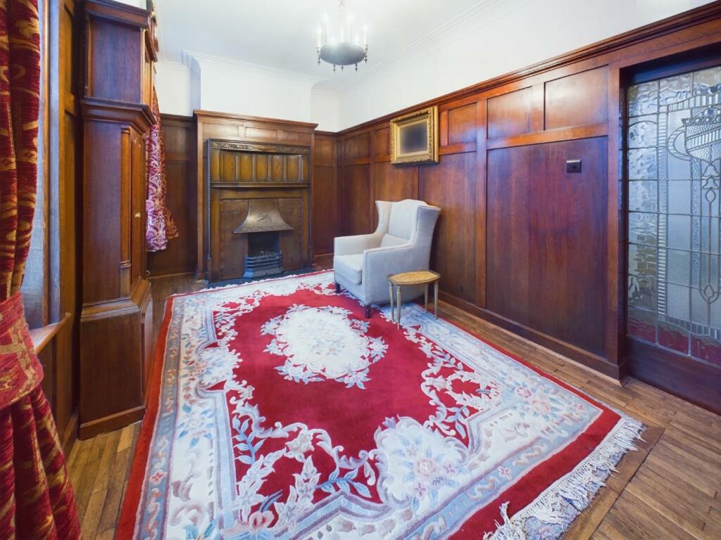 This three-bedroom apartment situated on Old Steine in Brighton offers a unique blend of period charm and modern living. The property boasts attractive original features, including substantial wood panelling, ornate fireplaces, and stained-glass windows, providing a distinctive character. However, some updating is required in several areas, including the kitchen which appears compact and somewhat dated in its current setup. The bathrooms shown in the images could also benefit from some modernisation. The flooring in certain rooms also seems to be in need of updating.