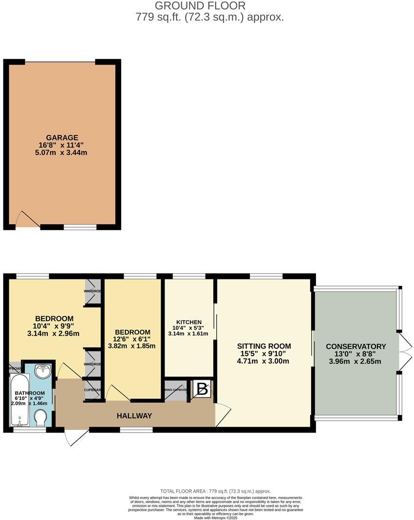 The property itself is a 2-bedroom, 1-bathroom bungalow with a total area of 778.23 sqft. The images reveal that the property requires some modernisation. The carpets and decor appear dated, and some minor repairs may be necessary. The kitchen and bathroom fixtures are also showing their age. The property has a small garden with a conservatory. The size of the garden is relatively modest.