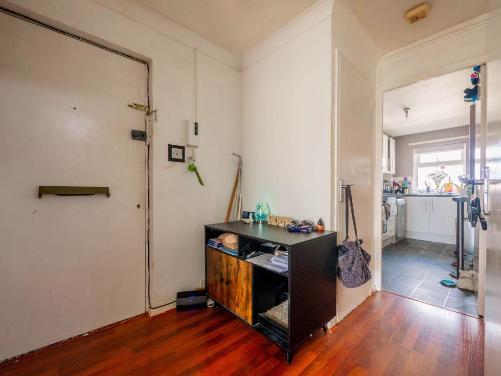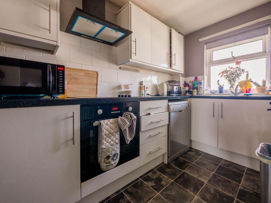 The property appears to be in good condition, with a modern kitchen and bathroom. The images do not show any significant signs of disrepair or damage. The property benefits from a small shared garden area.