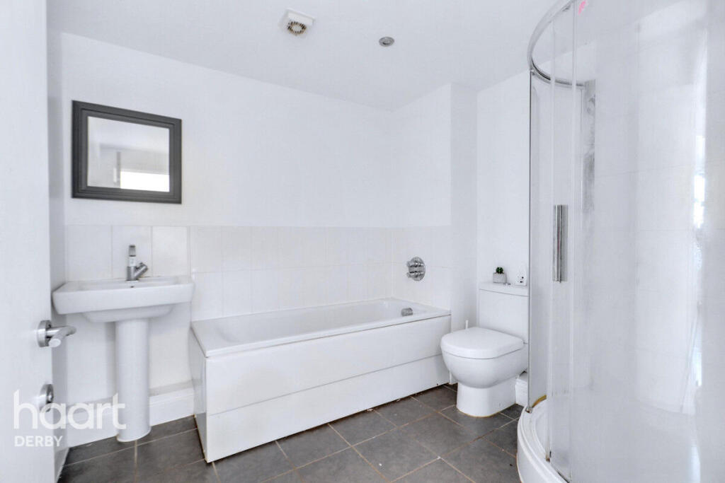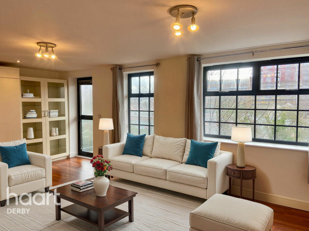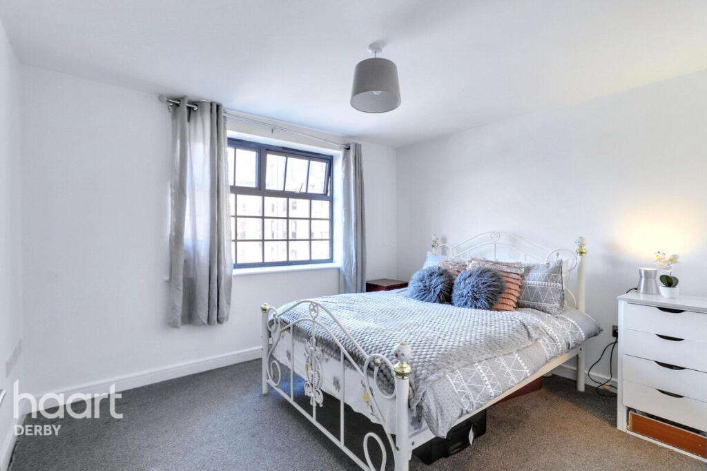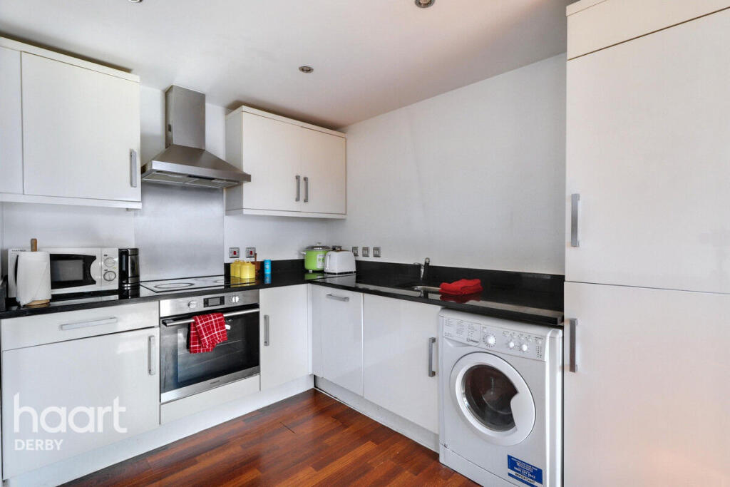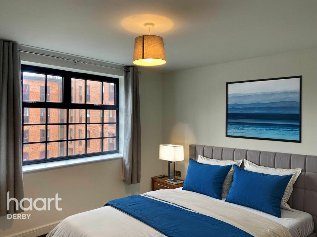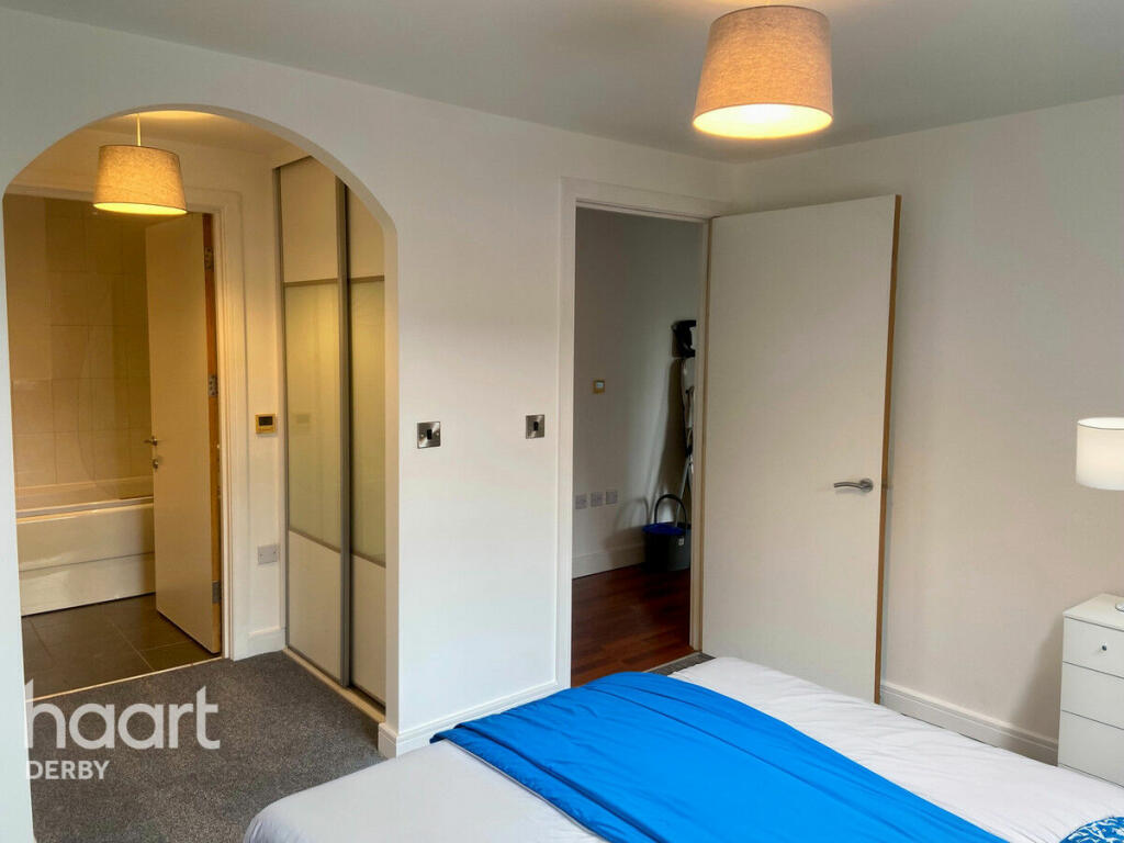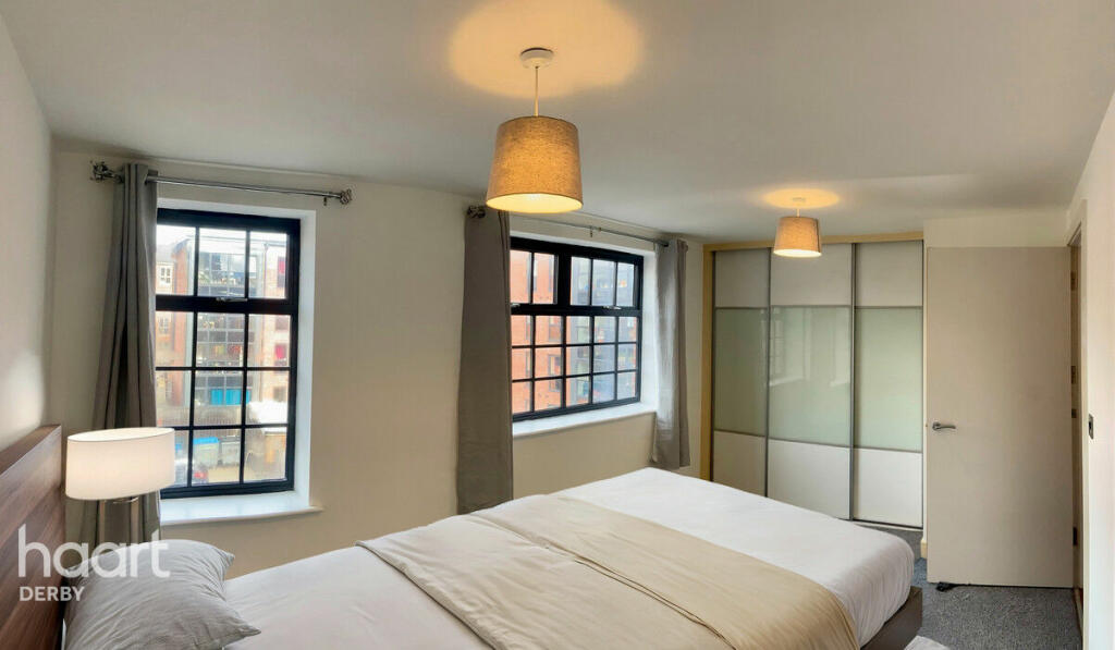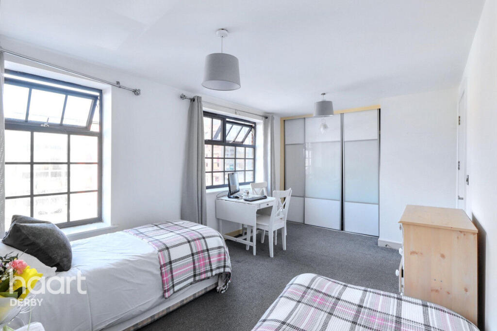 A spacious two-bedroom apartment in Derby City Centre, featuring an open-plan living area with modern kitchen, ample natural light, and access to a private balcony. Both bedrooms are generously sized with built-in wardrobes. Close to local amenities and transport links