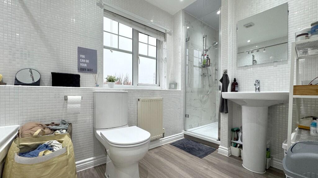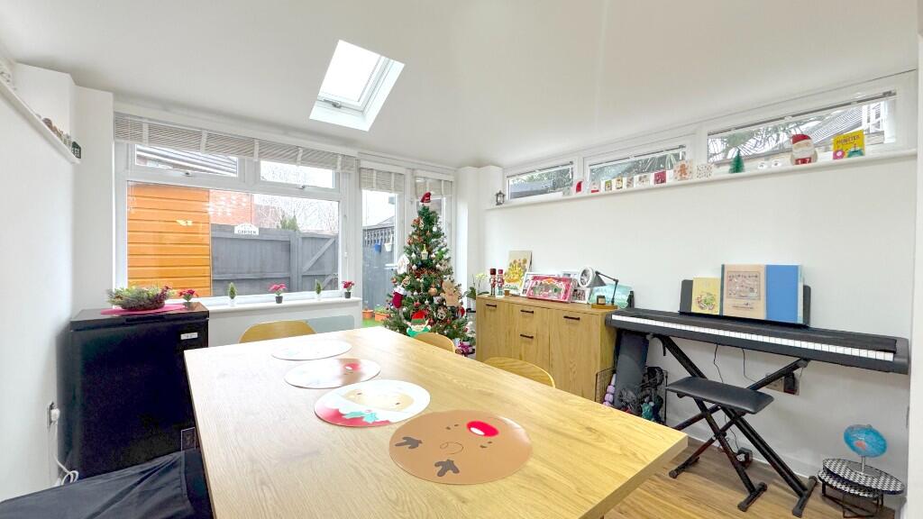 This is a three-bedroom terraced property located in Great Sankey South, Warrington. The house has two bathrooms and appears to be in good condition, with modern fixtures and fittings. It benefits from a garden with a shed. The property is located close to local schools and transportation links, including Warrington Bank Quay train station. The asking price of £300,000 seems reasonable when compared to other properties in the area. The property would suit a family.