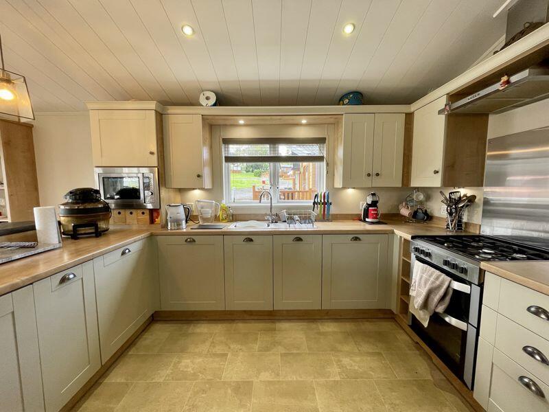 This property is a modern, two-bedroom, two-bathroom detached park home located in Roebeck Country Park near Ryde, Isle of Wight. The images showcase a well-presented interior with a modern kitchen, living area, and bedrooms. The property boasts an open-plan design enhancing space and natural light. The kitchen is fully equipped with modern appliances and ample counter space. The living area appears spacious with comfortable seating and access to a private deck providing external space. There are two well-appointed bathrooms. The bedrooms appear comfortable and well-sized.