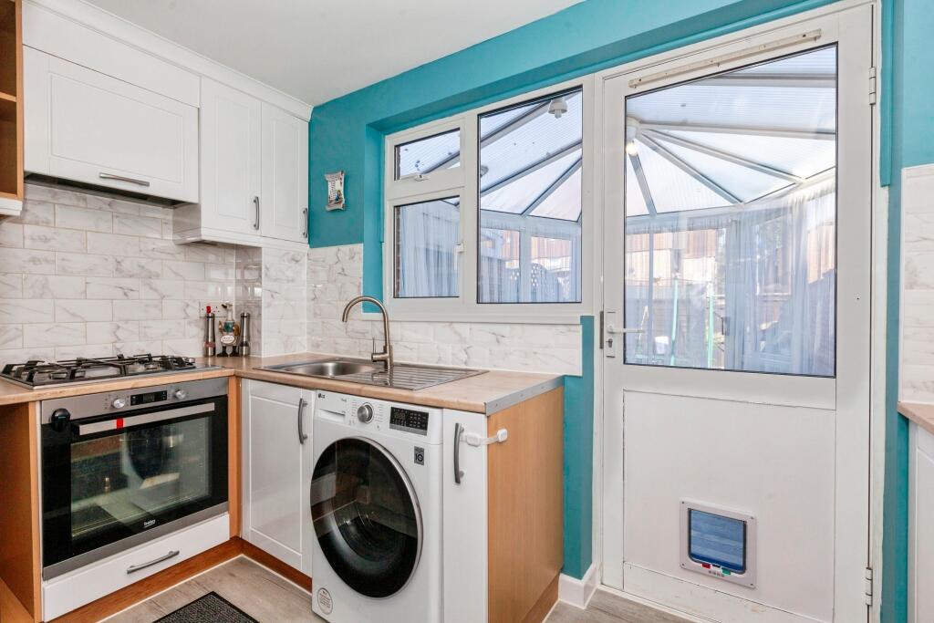 This is a one-bedroom terraced bungalow in Cippenham Meadows, Slough. The property appears to be in generally good condition, with a modern kitchen and bathroom. It benefits from a garden and is located within a reasonable distance of schools and transportation links. The asking price is in line with the average for the area. The property includes a conservatory. The property is listed with Purplebricks.