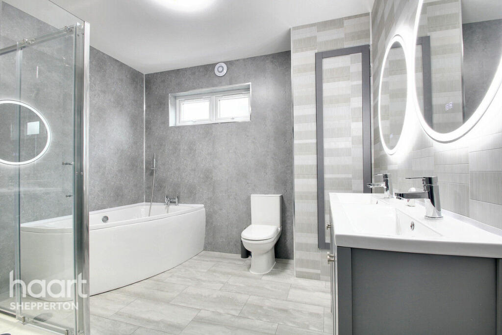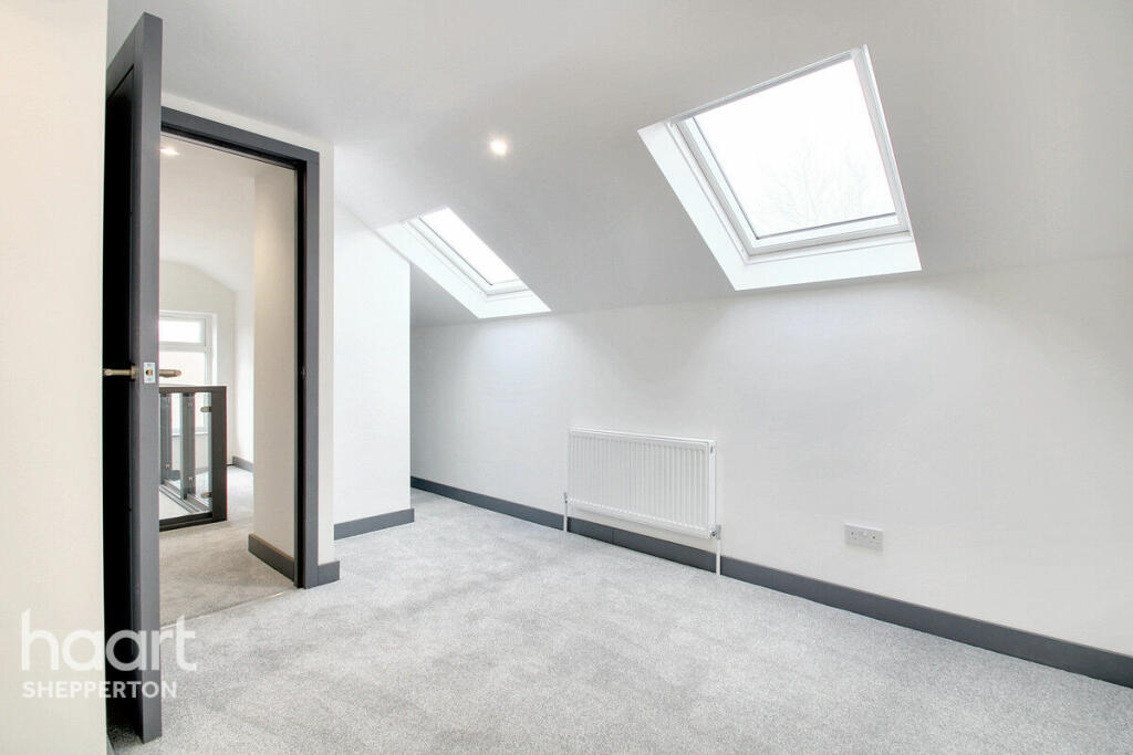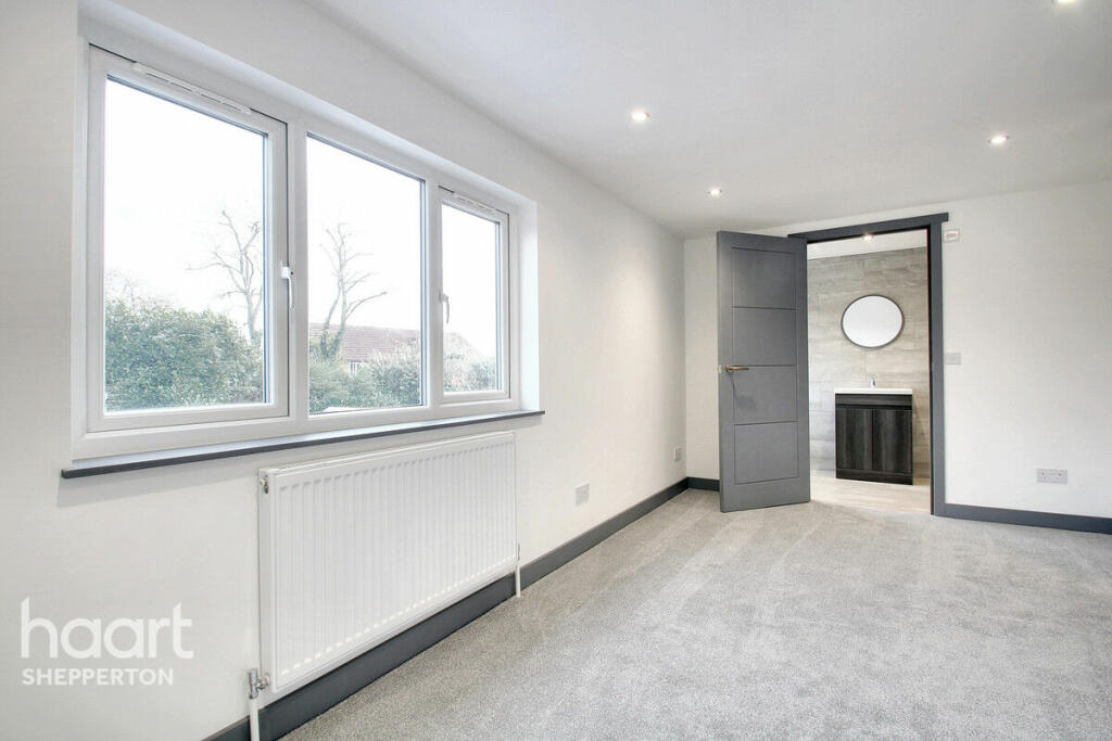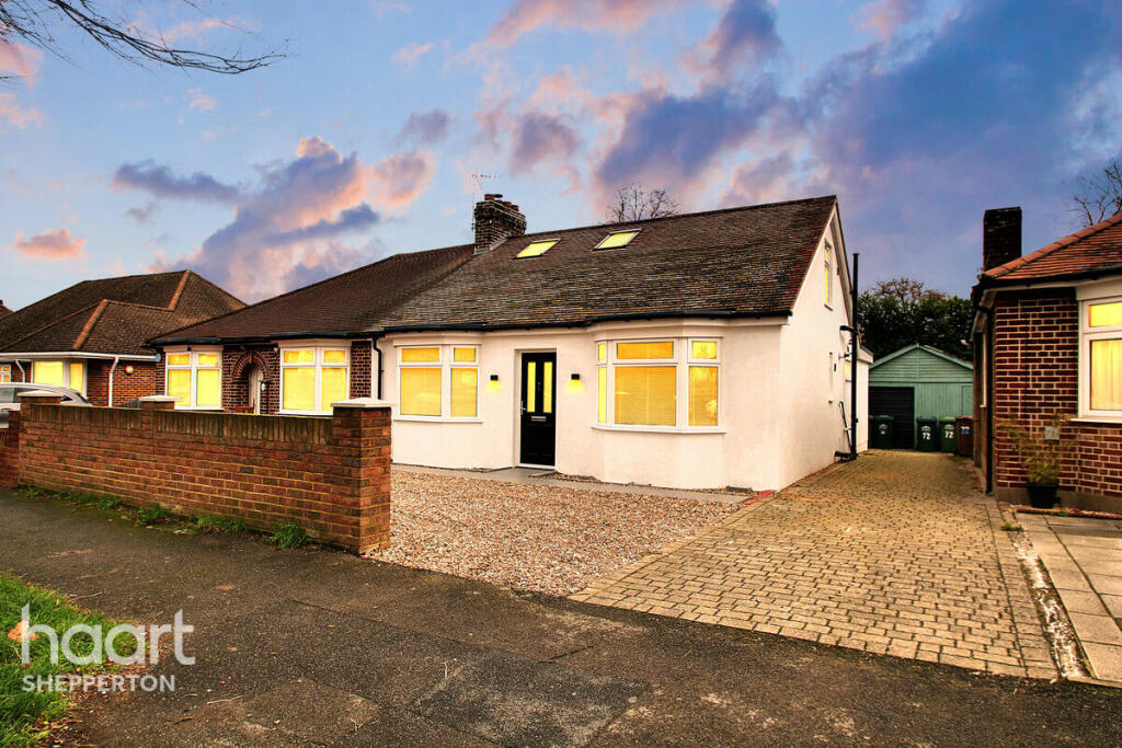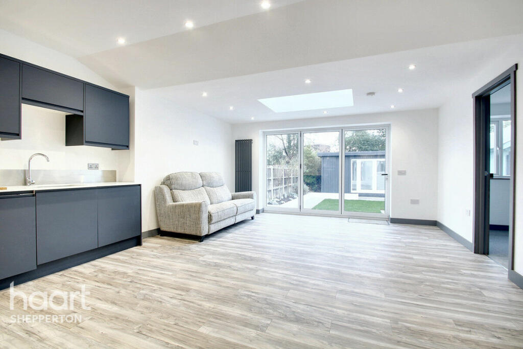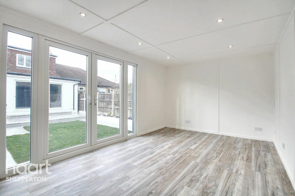 This beautifully renovated five-bedroom semi-detached bungalow on Vicarage Road in Sunbury-on-Thames offers modern living, versatility, and convenience