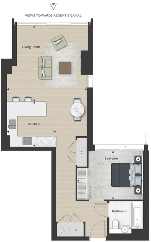 Spacious 1-bed, 1-bath apartment on the 5th floor, offering 710 sq ft with north-facing views over Regent's Canal. Includes floor-to-ceiling windows, underfloor heating, built-in wardrobes, residents' pool, spa, business lounge, and concierge. Prime Zone 1 location.
