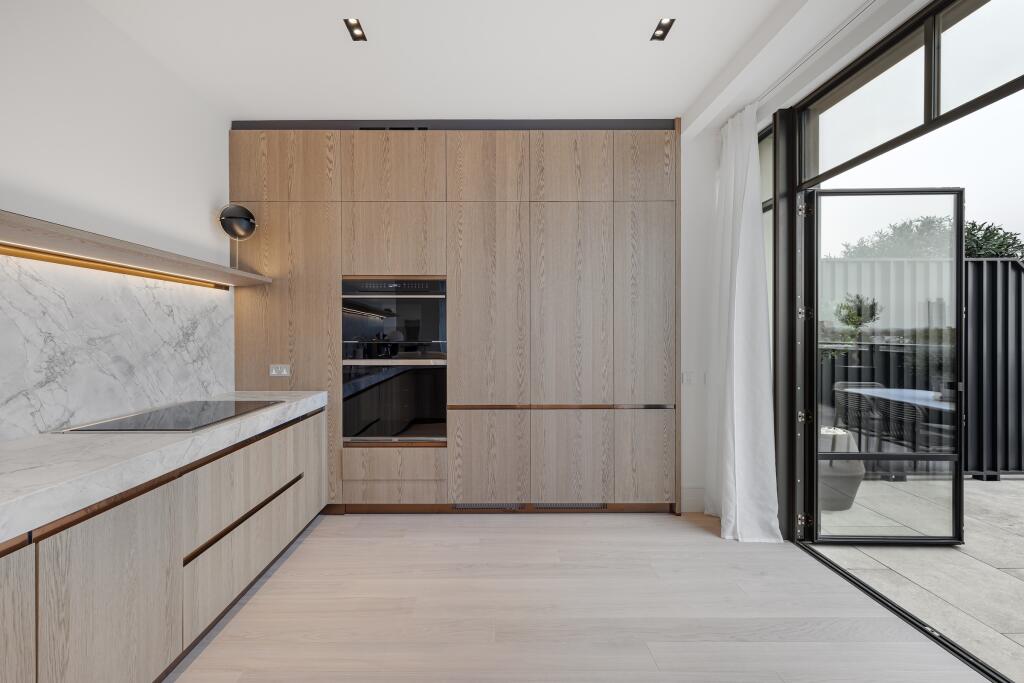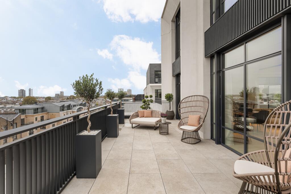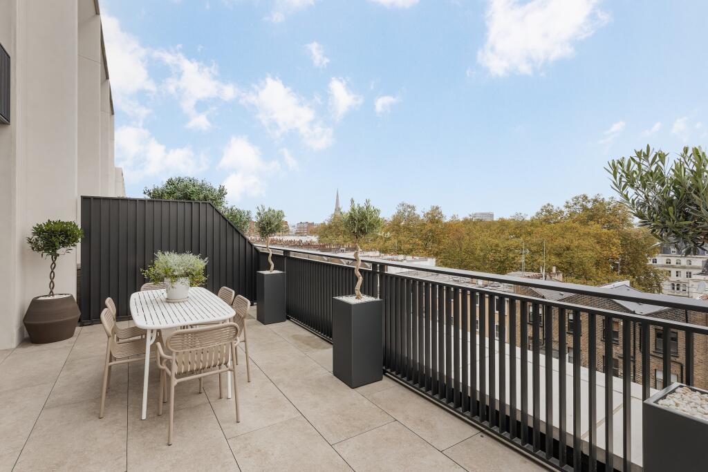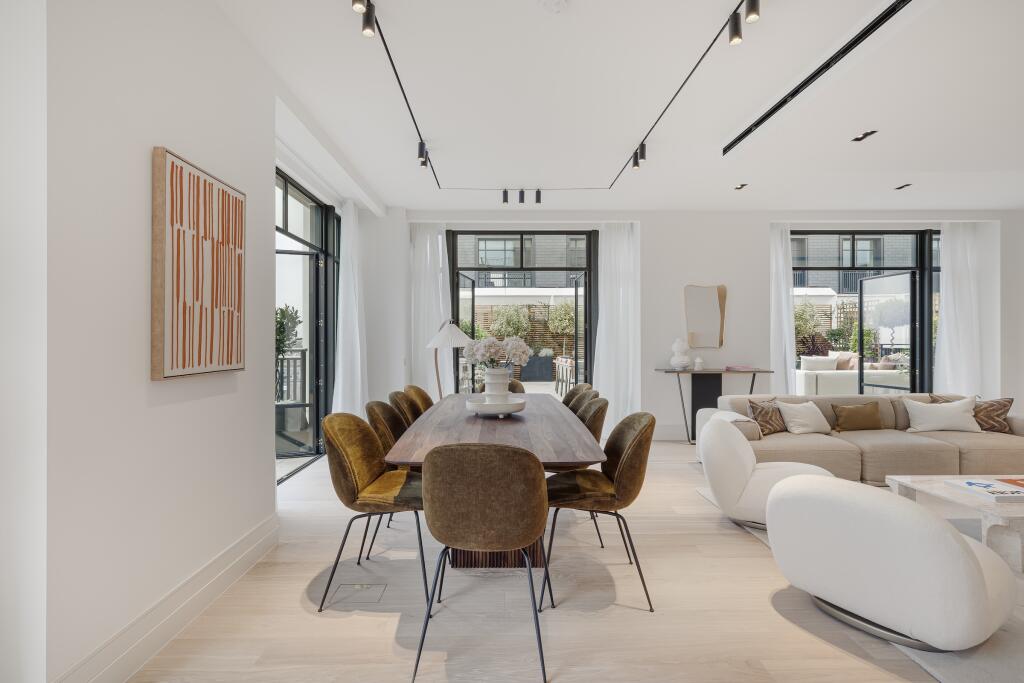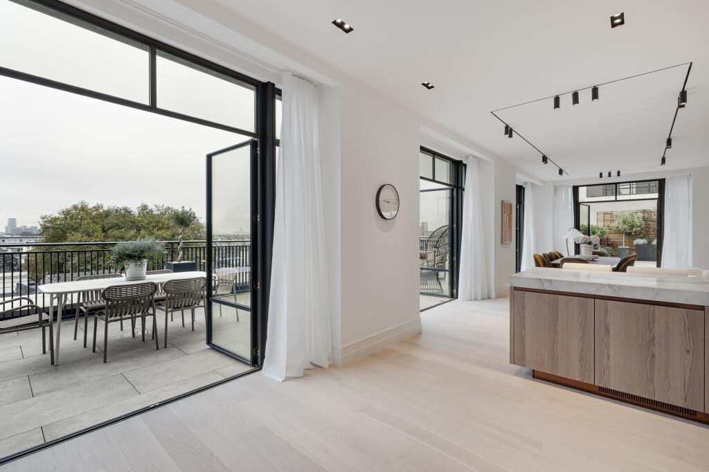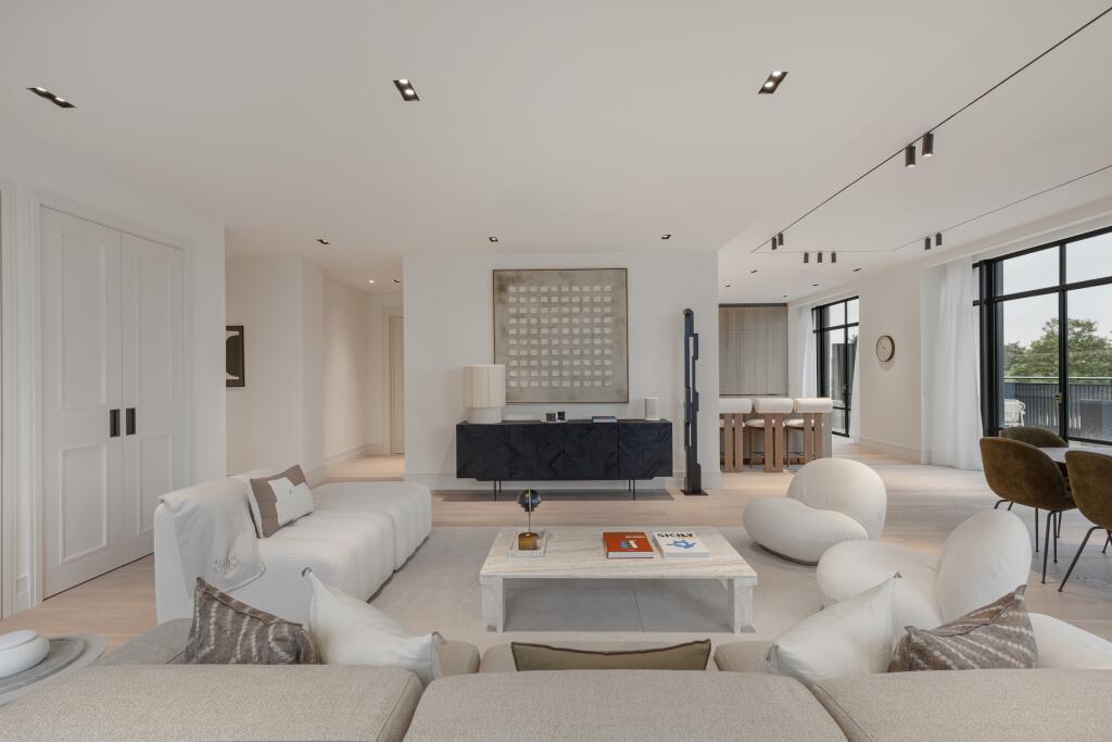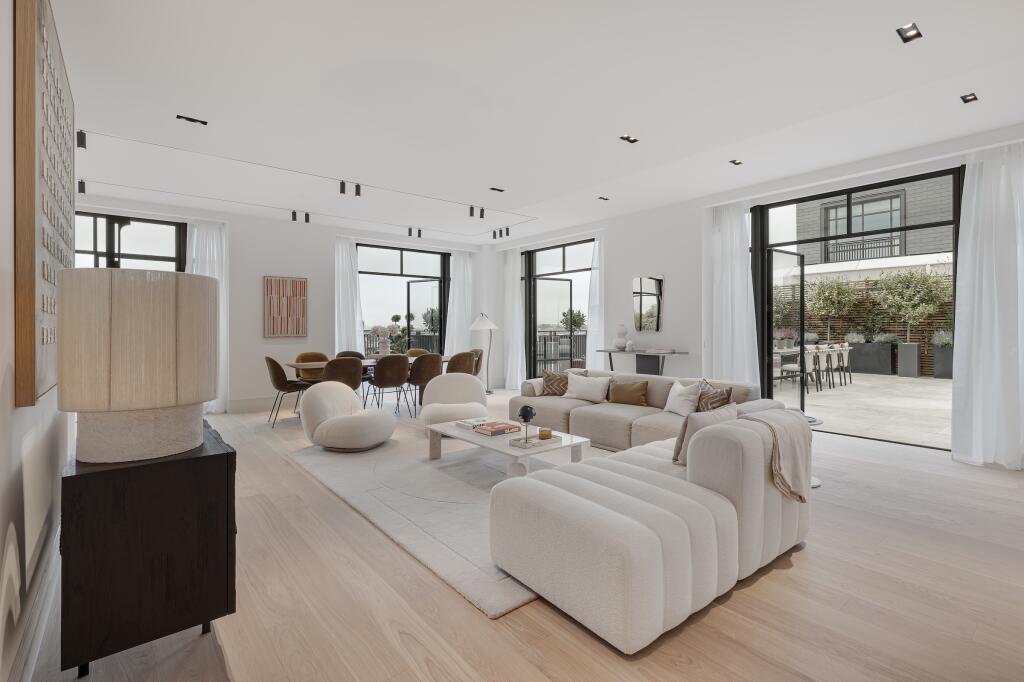 This three-bedroom, three-bathroom duplex penthouse located in the prestigious Whiteley development in Lancaster Gate, London, offers a luxurious and contemporary living experience. The property boasts a spacious open-plan layout with high ceilings and large windows that flood the apartment with natural light. The modern kitchen is beautifully appointed with integrated appliances, and the living area is designed for comfortable and stylish entertaining. The focal point of this property is undoubtedly its expansive outdoor terrace. The images showcase a large terrace offering ample space for relaxation, dining, and enjoying views.
