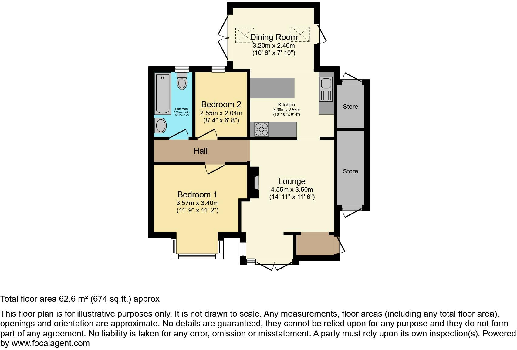 This charming 2-bedroom bungalow offers a comfortable and practical layout, perfect for anyone looking for a cozy and efficient living space. With a total area of approximately 62.6 m² (674 sq. ft.), the property includes: - **Two well-sized bedrooms:** Bedroom 1 measures 3.57m x 3.40m, providin...