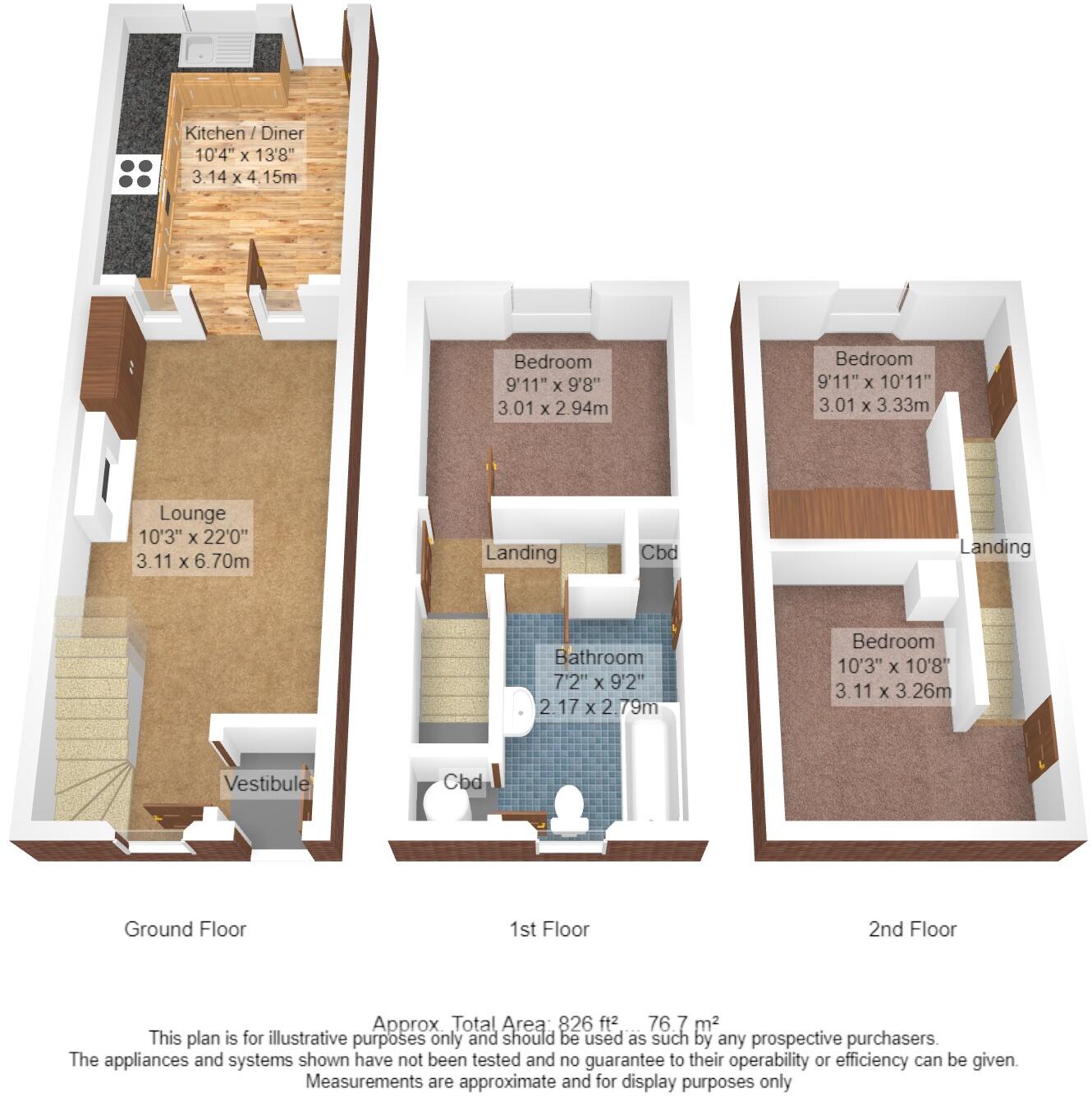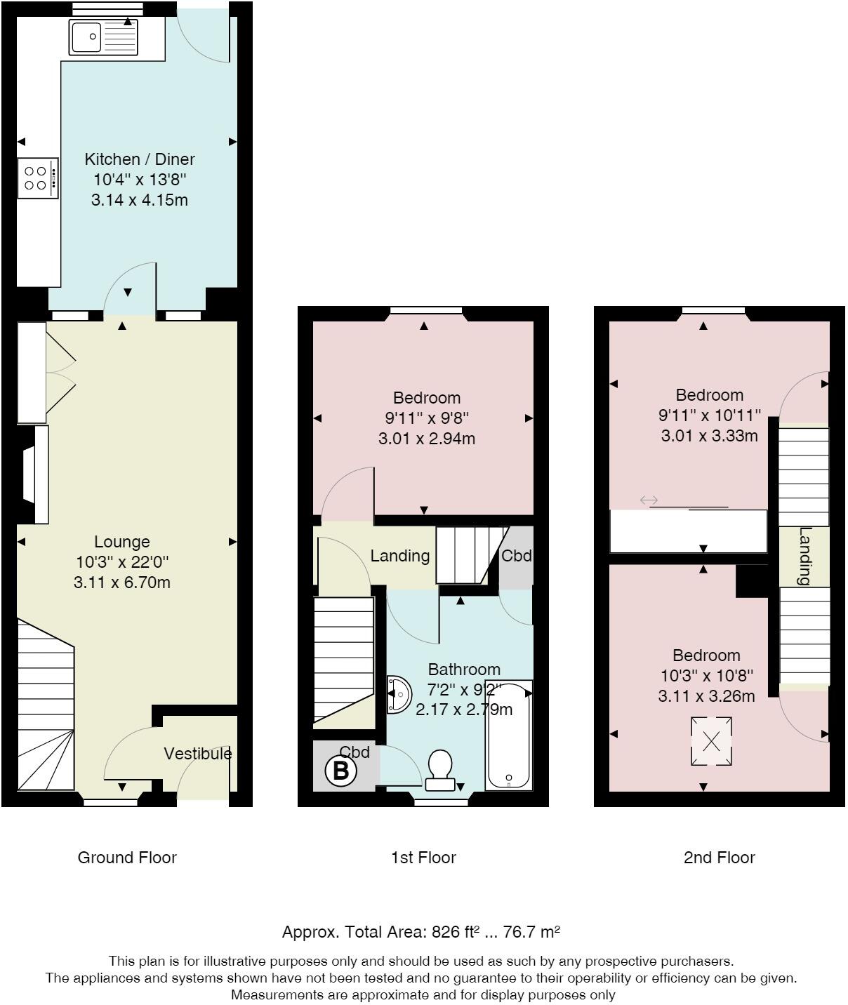 Freshly decorated three storey house close to town centre. Lounge, dining kitchen, three bedrooms and bathroom. Decked balcony and garage.