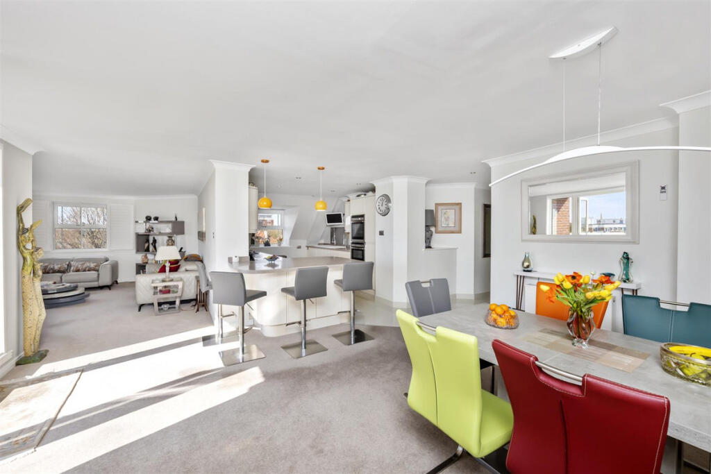 Discover an exceptional third-floor apartment in Hove, featuring a south-facing terrace and two private parking spaces. This spacious 147 sq. mt (1582 sq. ft) home offers incredible open-plan living and a superb fitted kitchen. Boasting three bedrooms, two bathrooms, and generous storage