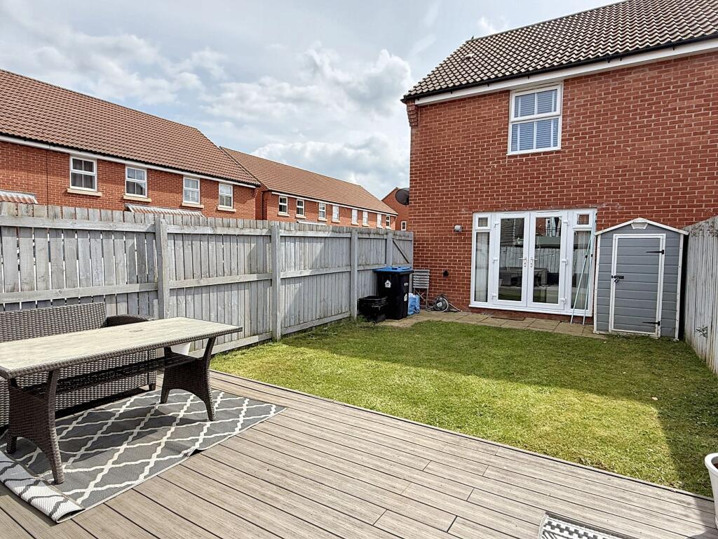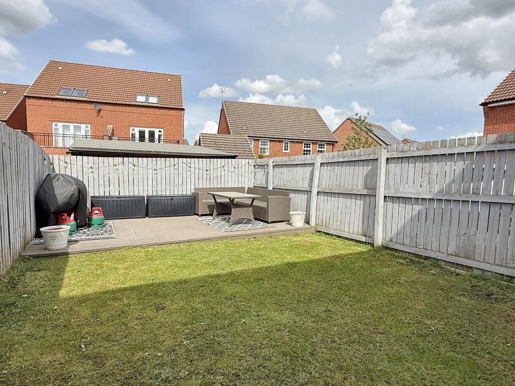 The plot size is not specified, however, the images indicate a manageable rear garden with a patio area. This is suitable for outdoor entertaining or family use.