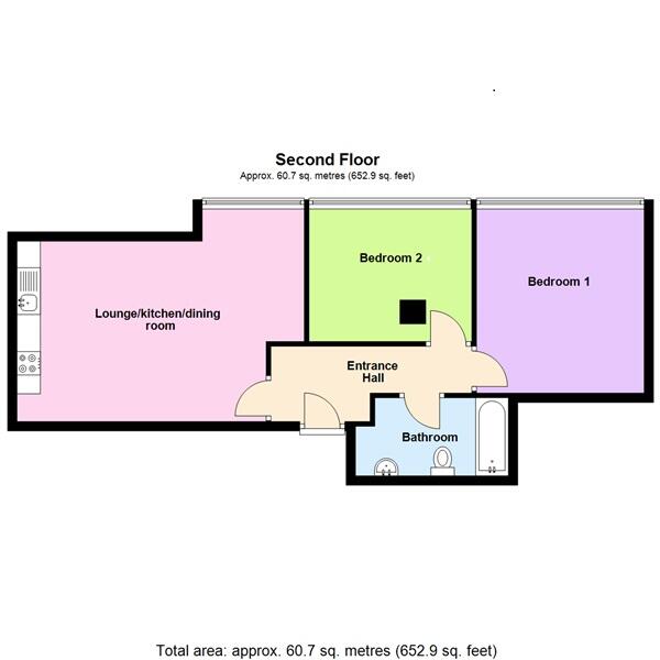 Situated in the town centre and local to all amenities is this excellently presented two bedroom second floor flat which benefits from open plan 20ft kitchen/lounge/dining room with built in appliances, gas radiator central heating and an allocated parking space. The property further offers 8ft h...
