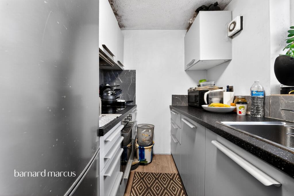 This is a studio flat in Edmonton Green, London, marketed by Barnard Marcus. The property offers 336.91 sqft of living space and is listed for £165,000. The flat is located within 0.5 miles of Edmonton Green station and several schools. The interior photos suggest that the property requires some modernisation. The price is below the local average, potentially reflecting the condition and size of the property.