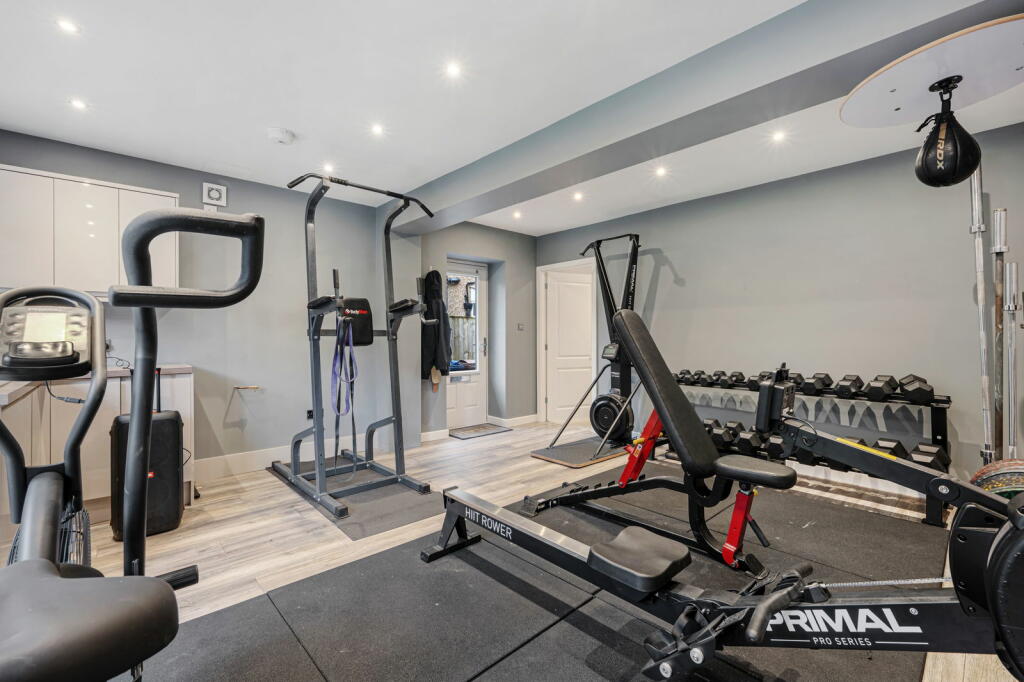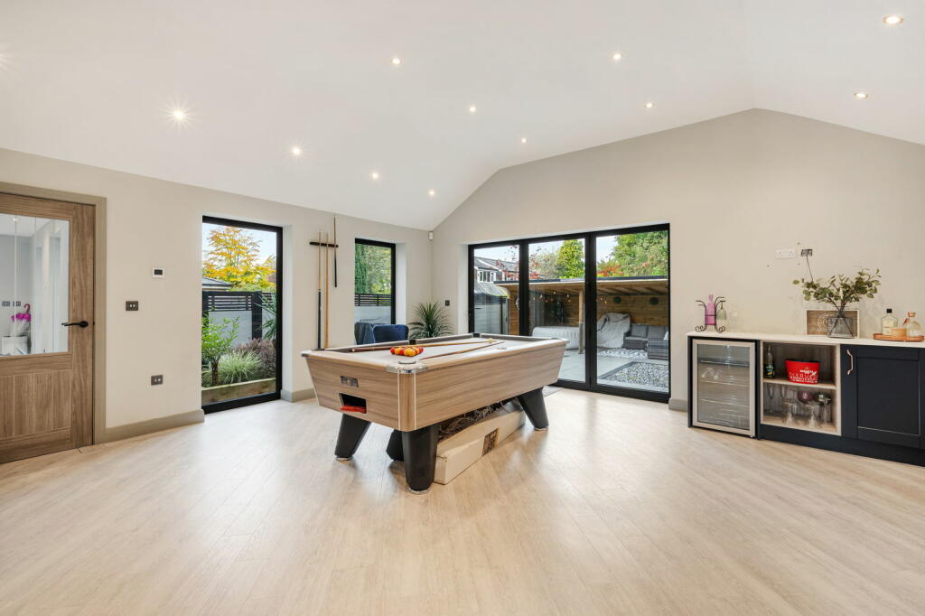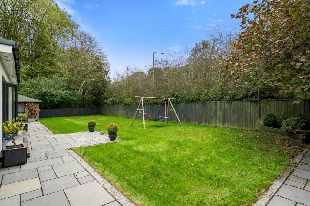 Beyond the interior, the substantial garden provides ample outdoor space, including well-maintained lawns, patio areas, a hot tub and an outdoor kitchen/barbecue area under a covered structure. This area offers significant potential for outdoor living and entertaining.