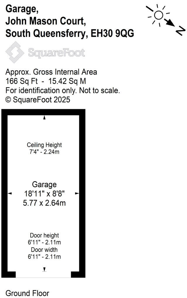 Secure Private Garage Approx. 166 Sq.ft (15.42sq m) Internal Area Ceiling Height of 7.4ft (2.24m) Door (H) 6.11ft x (W) 6.11ft Quiet Location An excellent opportunity to acquire a secure single garage situated in the picturesque town of South Queensferry. This garage offers a gross int...