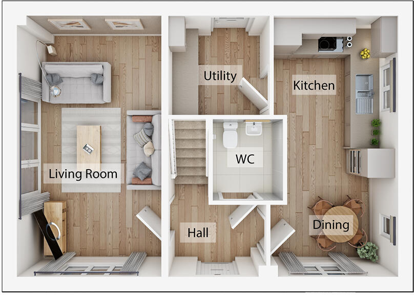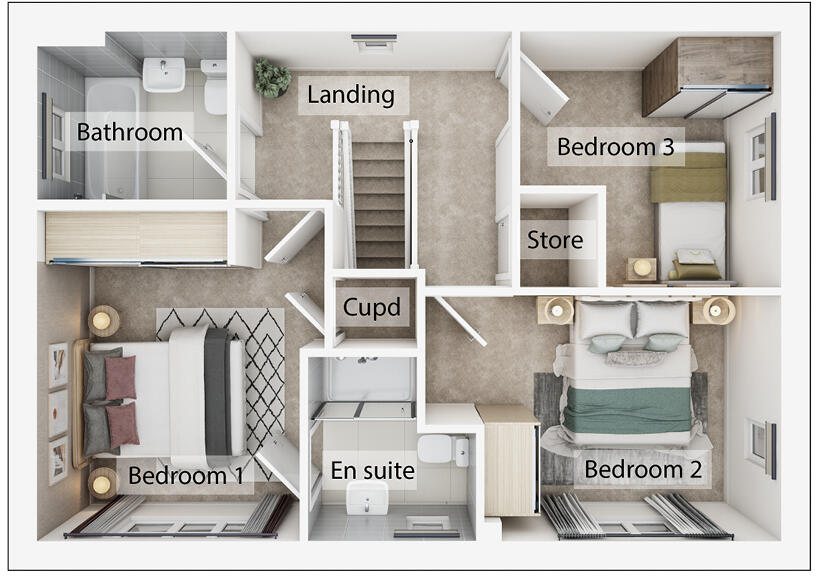 The Heatherdene features a living room with French doors, an open-plan kitchen/breakfast room and a utility room with garden access, storage cupboards and downstairs WC. Upstairs, there are three bedrooms - bedroom one is en suite - a bathroom and further storage cupboards.