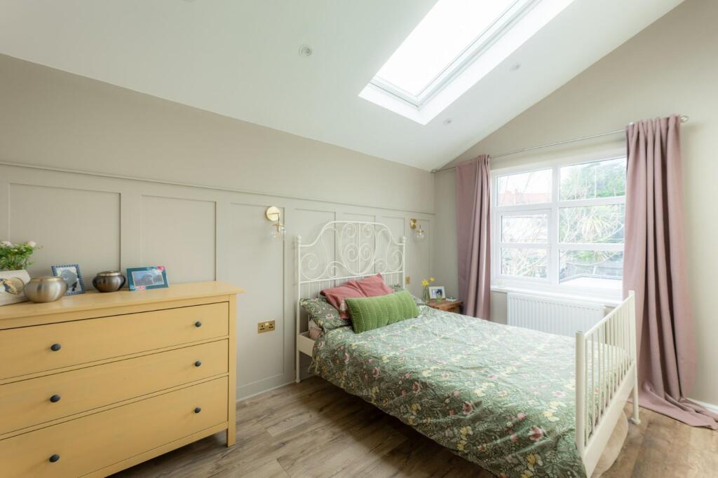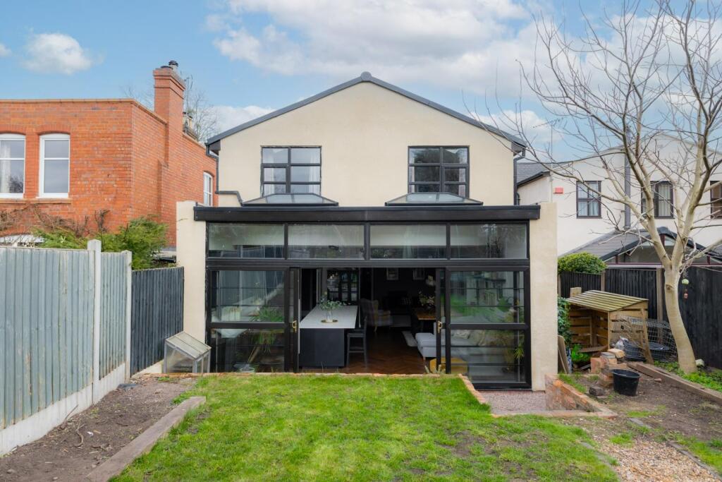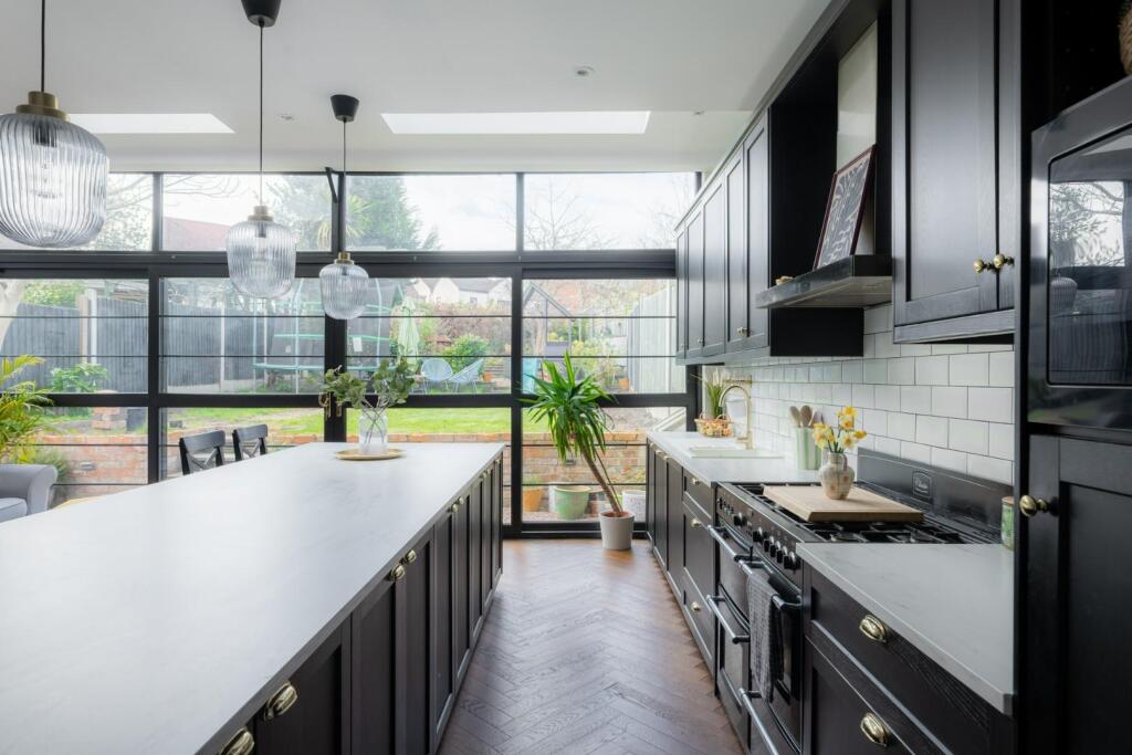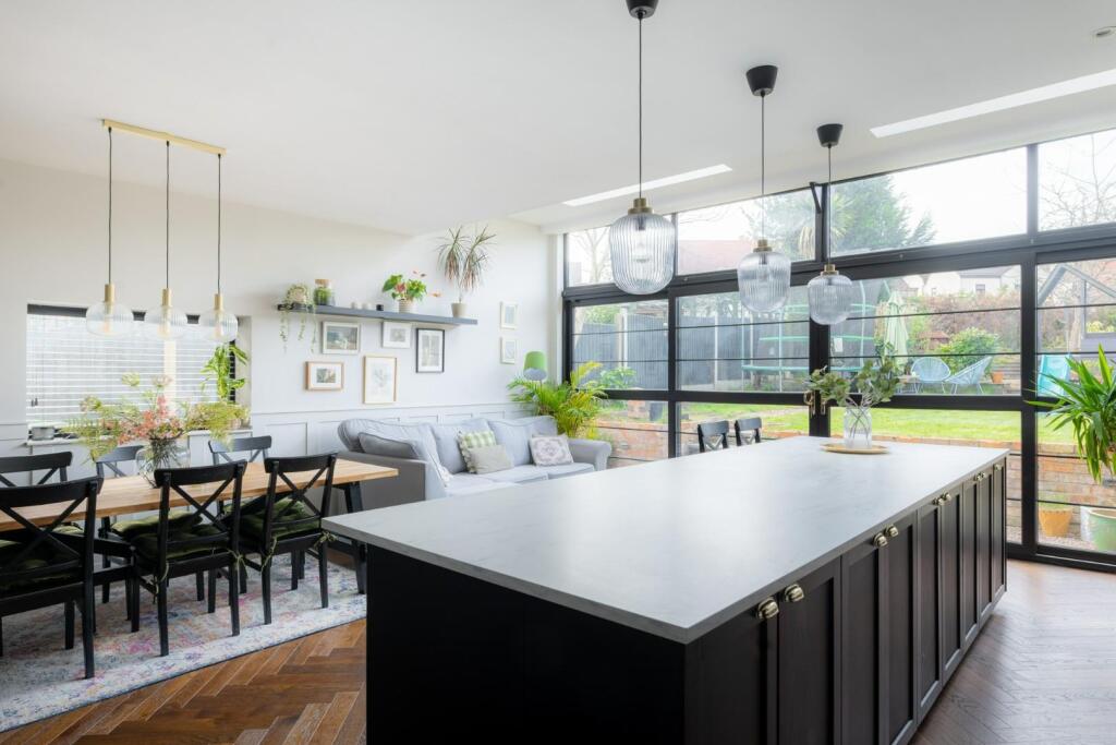 The property appears to have undergone a significant renovation, with a modern kitchen and extension to the rear. The extension features large windows and bi-fold doors, opening onto a garden. The interior is presented in excellent condition, with modern fixtures and fittings throughout. The garden is of a reasonable size, providing space for outdoor living.