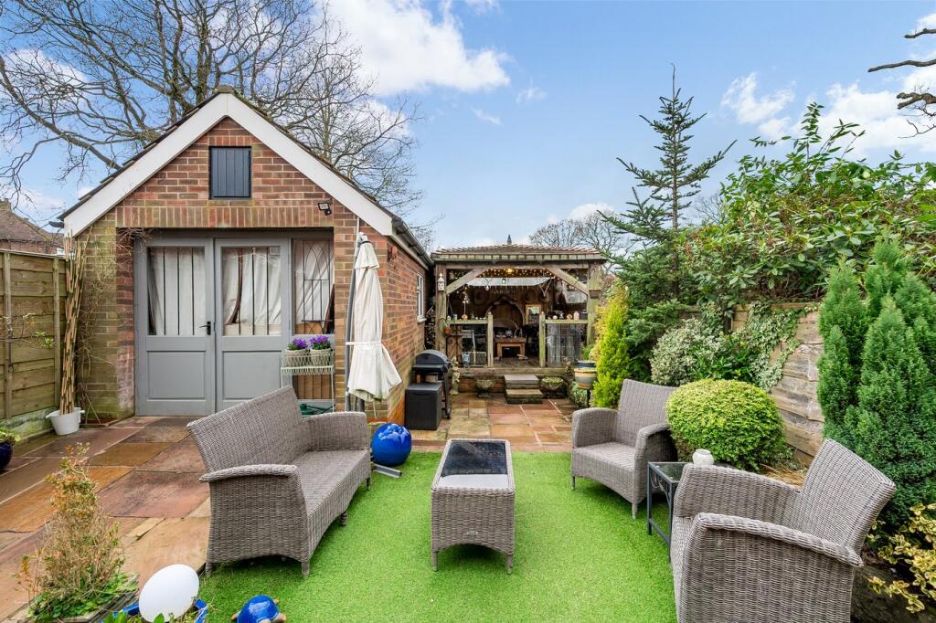 The property includes a garden, adding to its appeal and providing outdoor space. The garden is relatively small but well-maintained and features a patio area, a gazebo, and various plants and shrubs.