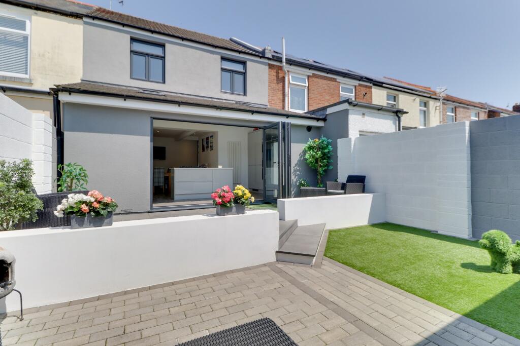 Facing mature trees the mature trees of Langstone Primary School, this three-bedroom terraced home has been extensively refurbished and extended to provide a high-quality finish with comfortable space that would suit a family. A renovated double garage at the rear is currently used as hobbies/wor...