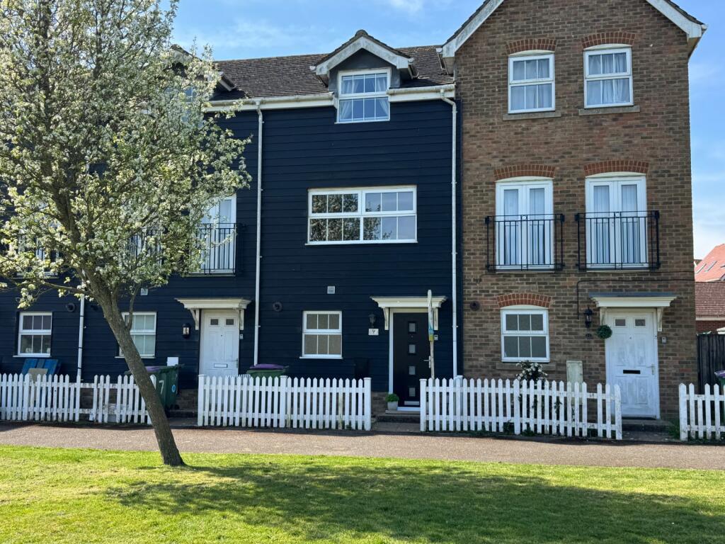 This three-bedroom, three-bathroom terraced house in Hawkinge, Folkestone is presented in excellent condition. The property benefits from modern fixtures and fittings throughout, and the interior is well-maintained and stylish. The images show a contemporary kitchen, modern bathrooms, and comfortable living spaces. The property also includes a well-maintained garden, providing a private outdoor space.