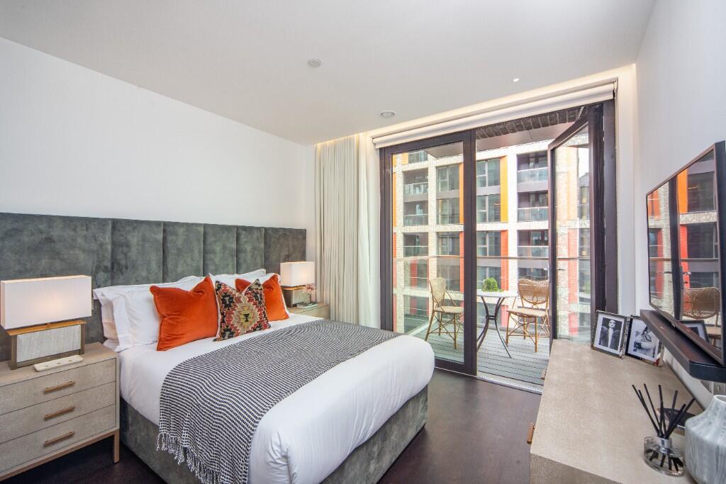 An impressive interior designed 1,123 Sq Ft three double-bedroom, two-bathroom apartment located in Thornes House forming part of The Residence Collection in Nine Elms on London's iconic South Bank.