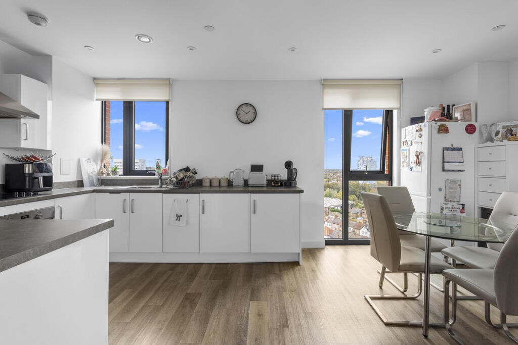 This beautiful, light and contemporary two double bedroom, two bathroom apartment is quietly situated on the 11th floor and benefits from far-reaching views across the surrounding area
